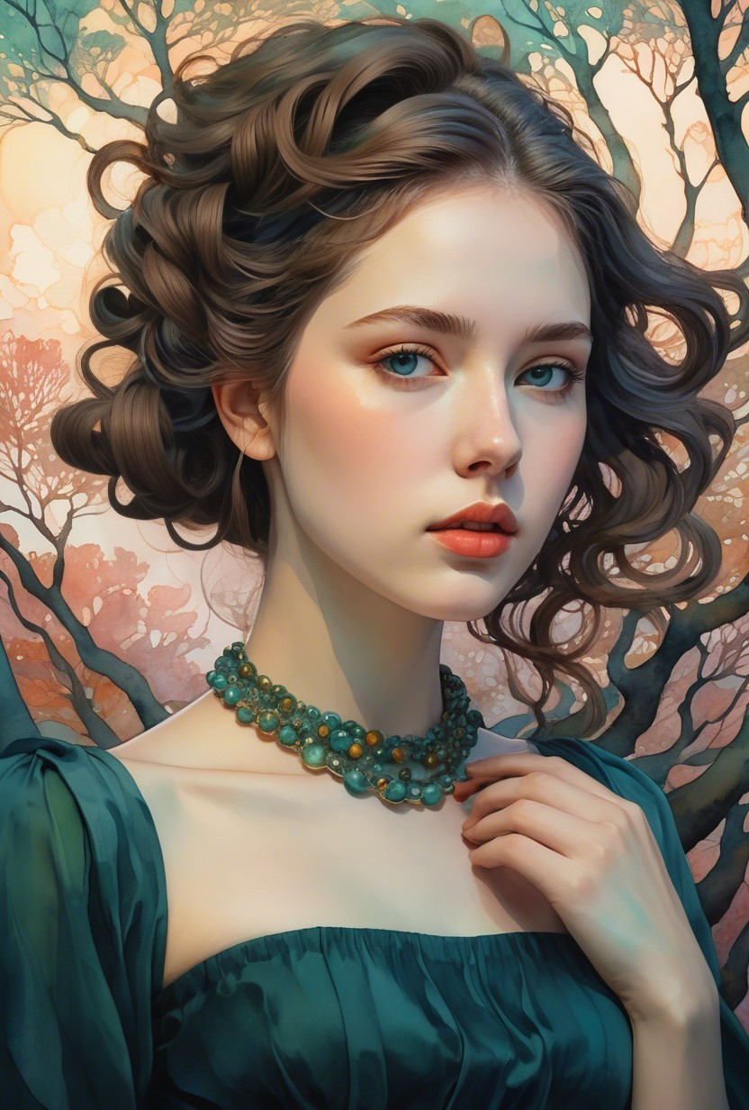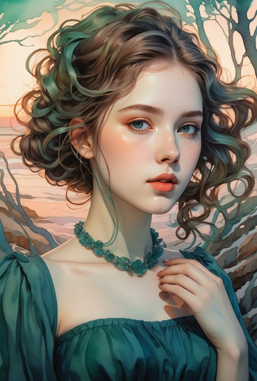 Prompt: watercolor and ink, squiggly line-art, portrait, cottagecore merged with witchcore aesthetics, warm dynamic lighting, pale blue, sea-green, auburn, hallucinogenic, hues by overton loyd, studio ghibli style, tesselated, fluidity, overflow, post-impressionism, stylized abstract headshot intricate flowing hair illusion, stippled, blotted, tesselated, cel-shaded, moonlight silhouette, raytraced shadows, high contrast lighting, sfumato, digital painting, maximalist style,exuding a delicate yet mysterious aura. Her face is detailed with multi-layered eyes, flaring gaze, abstract, artistic, magical ,zentangle, tiny filaments, aquatint extrusion, luminous glittering, appealing, mesmeric, warm color palette featuring shades of pale blue and warm beige, pointillism details. The lighting is soft and diffused, enhancing the magical and mystical ambiance, overall composition is by Georgia O'Keeffe and Man Ray, combining elements of casual line and wash sketch with a foampunk twist. The artwork is rendered in UHD HDR using Octane render, emphasizing a cinematic and comic book art style. diaphanous, dots, flecks, pointilism, gossamer textures intertwining, night lighting, smoothly related contours, style of YvesTanguy, embodiment of Alfred Kubin, asymmetric composition in the spotlight, supergrunge, acidic neonoir convoluted, bubblegumstyle, zentangle lines, tousled, kinky, flares and dripping clouds, red tones, squiggly line-art features, baroque rococo, subtle academical, synthetic essence, alcoholic inkpunk 1.8, subsurface scattering 1.2, cel-shaded, colorful yam, xeroxed, stylized filigree, luminous plasticity 1.6,
