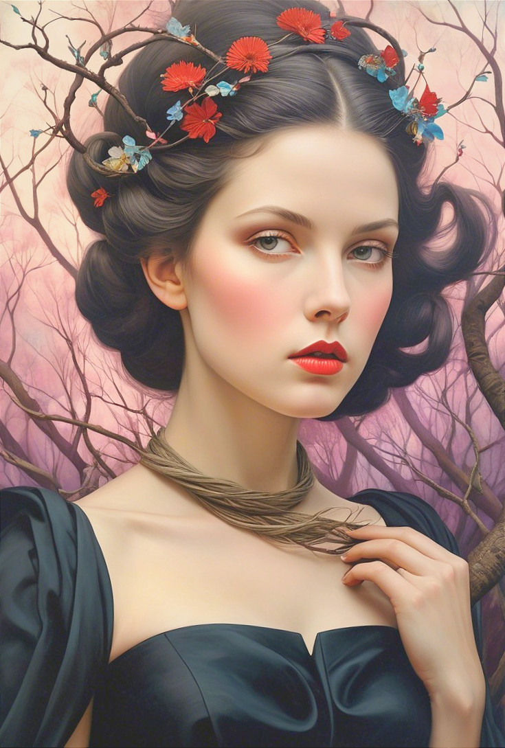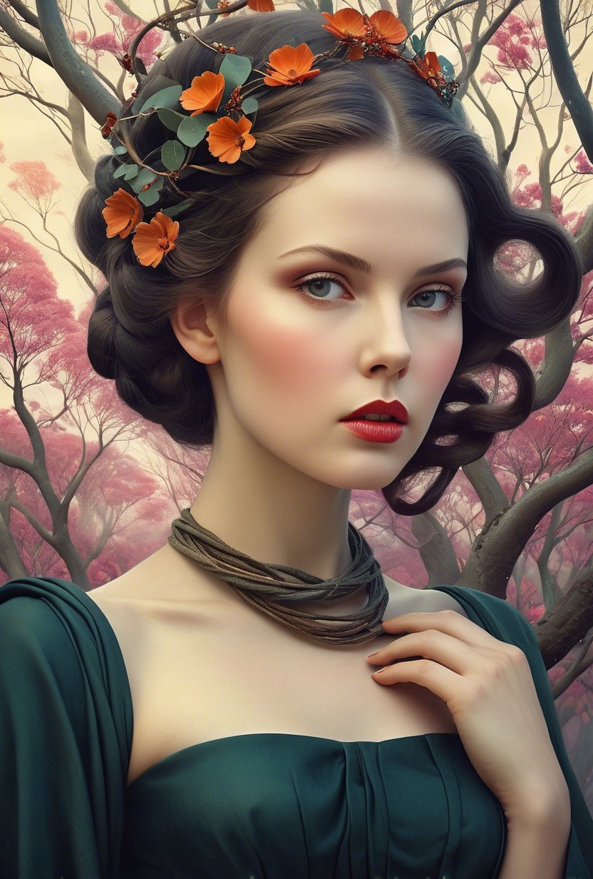 + Prompt:A fierce female warrior stands amidst twisted trees and whimsical flora, exuding an enchanting aura. The scene is brought to life by the artistic flair of Catrin Welz-Stein, blending Figurative Art with the captivating color palettes of Endre Penovac and Kaia Coopman. The oil on canvas masterpiece boasts a broad spectrum of colors, with intense detail resembling intricate line art, ideal for a decorative and lavish print reminiscent of ethnic fabric. Thick clouds loom overhead, diffusing dappled silver light onto the mystical setting.