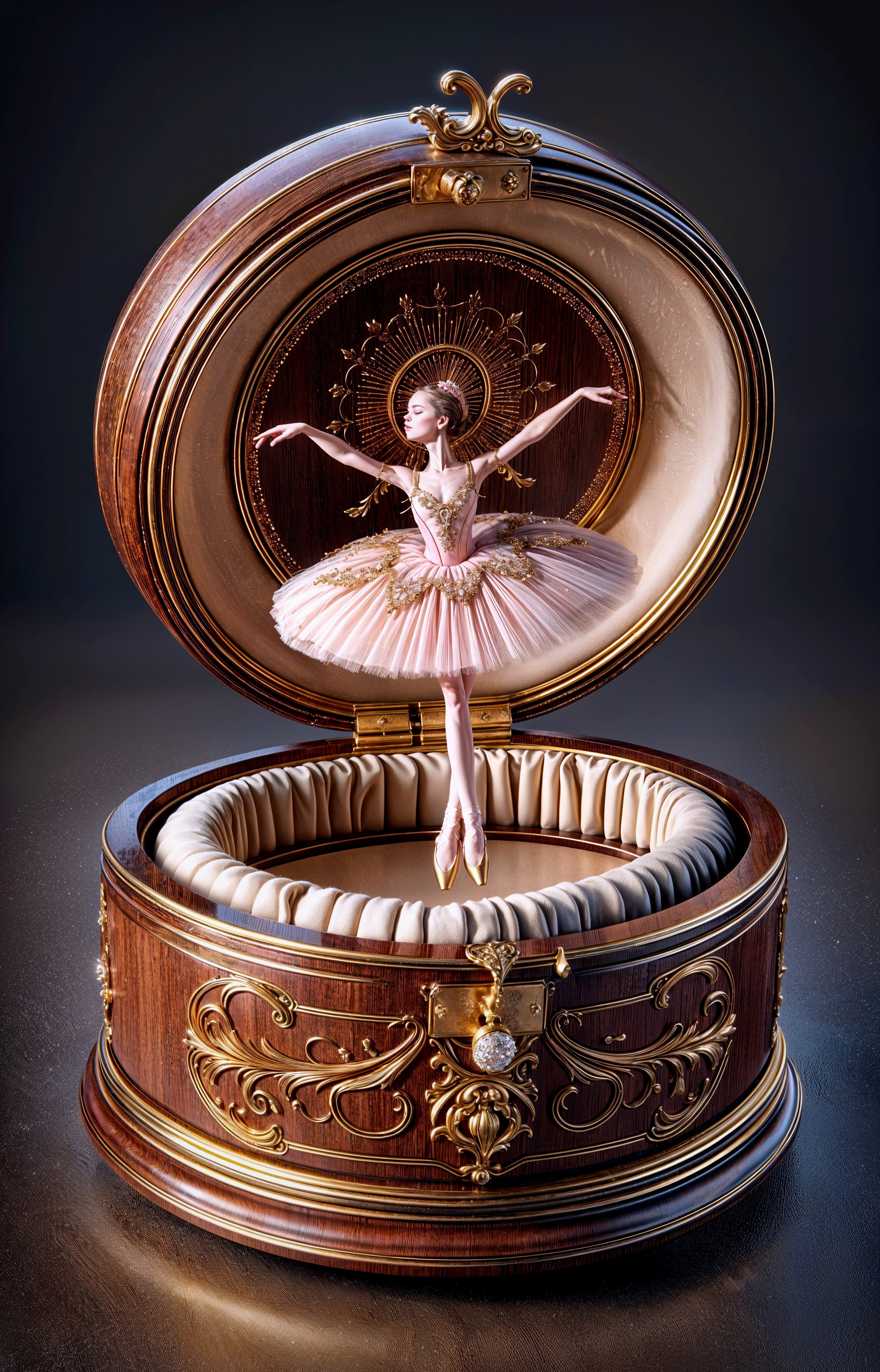 A digital painting of an elegant wooden ballerina music box with intricate gold details. The circular box features a delicate ballerina in a pink tutu, set against a cream velvet lining, exuding a nostalgic and enchanting aura.