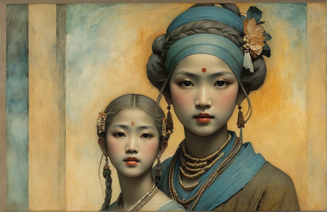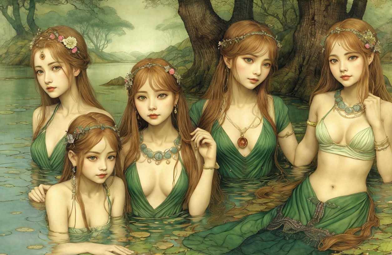 Four graceful figures emerge from a serene pond, surrounded by lush green lily pads. The women, with flowing hair adorned with flowers, exude a tranquil, ethereal beauty.