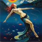 A whimsical figure with flowing hair stands amidst colorful, swirling clouds of vibrant hues. The background features deep blue, enhancing the dreamlike, artistic nature of the scene.