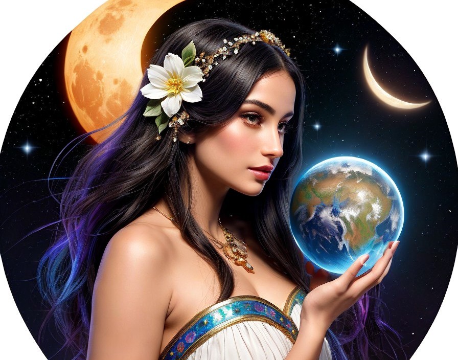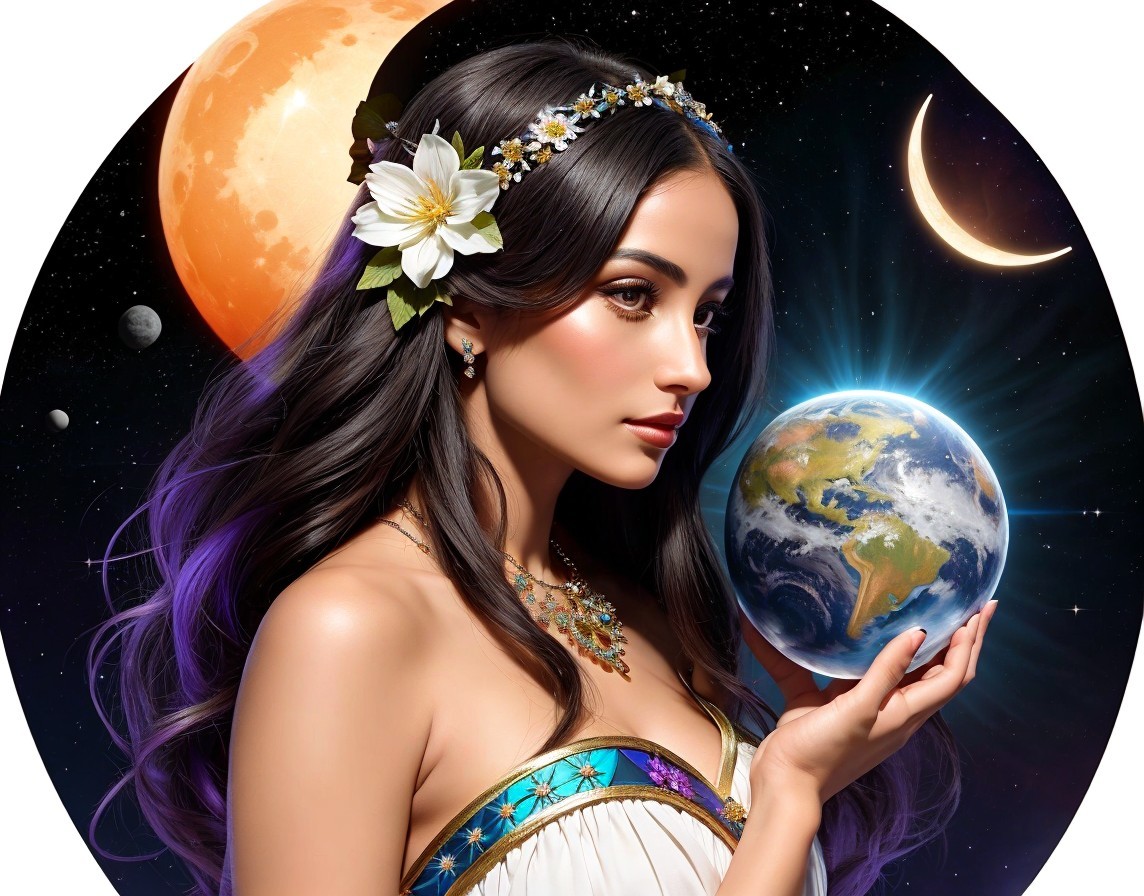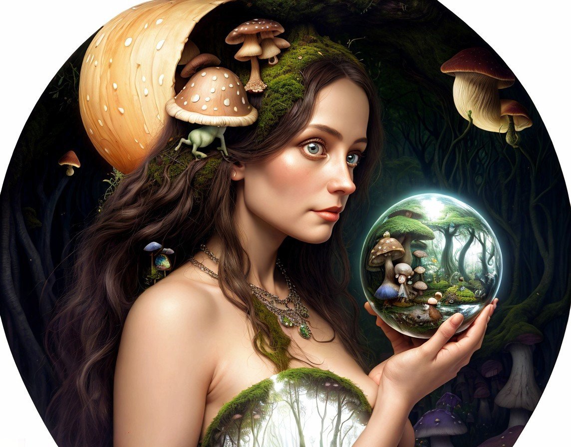 A fantasy-inspired artwork depicting a woman with mushroom motifs and a crystal ball illustrating a miniature world within.