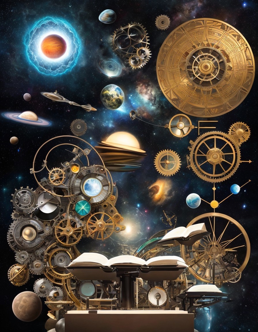 Prompt: "a visually rich collage that symbolizes the endless journey of intellectual discovery. The artwork should have a deep space backdrop, This figure stands as a metaphor for the continuous growth of knowledge. Intersperse throughout the scene various symbols signifying different fields of study:atoms for science, musical notes for arts, and interlocking gears for technology. These elements should blend seamlessly into the cosmic tableau, brimming with stars, galaxies, and nebulae to represent the vastness of the universe. Overlay this with imagery of ancient manuscripts, telescopes, floating mathematical equations, and an ever-expanding galaxy."