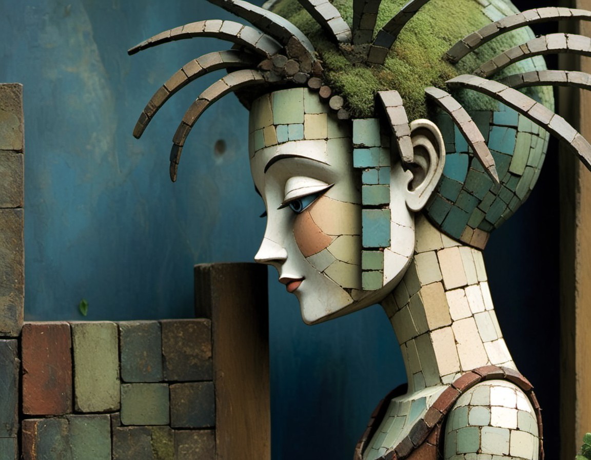 An artistic depiction of a female figure with an elaborate headdress touching a brick wall with a crescent moon.