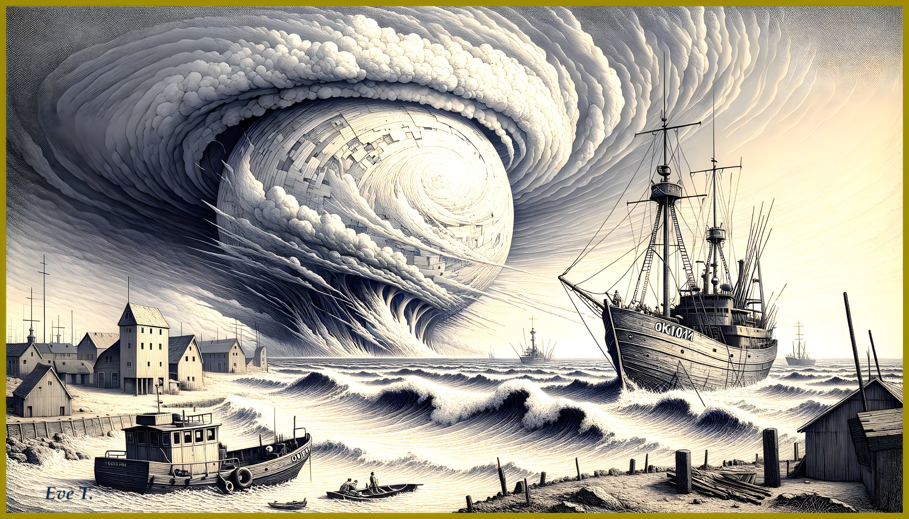 A surreal black and white illustration featuring a town by the sea with massive, swirling clouds and ships braving tumultuous waves.