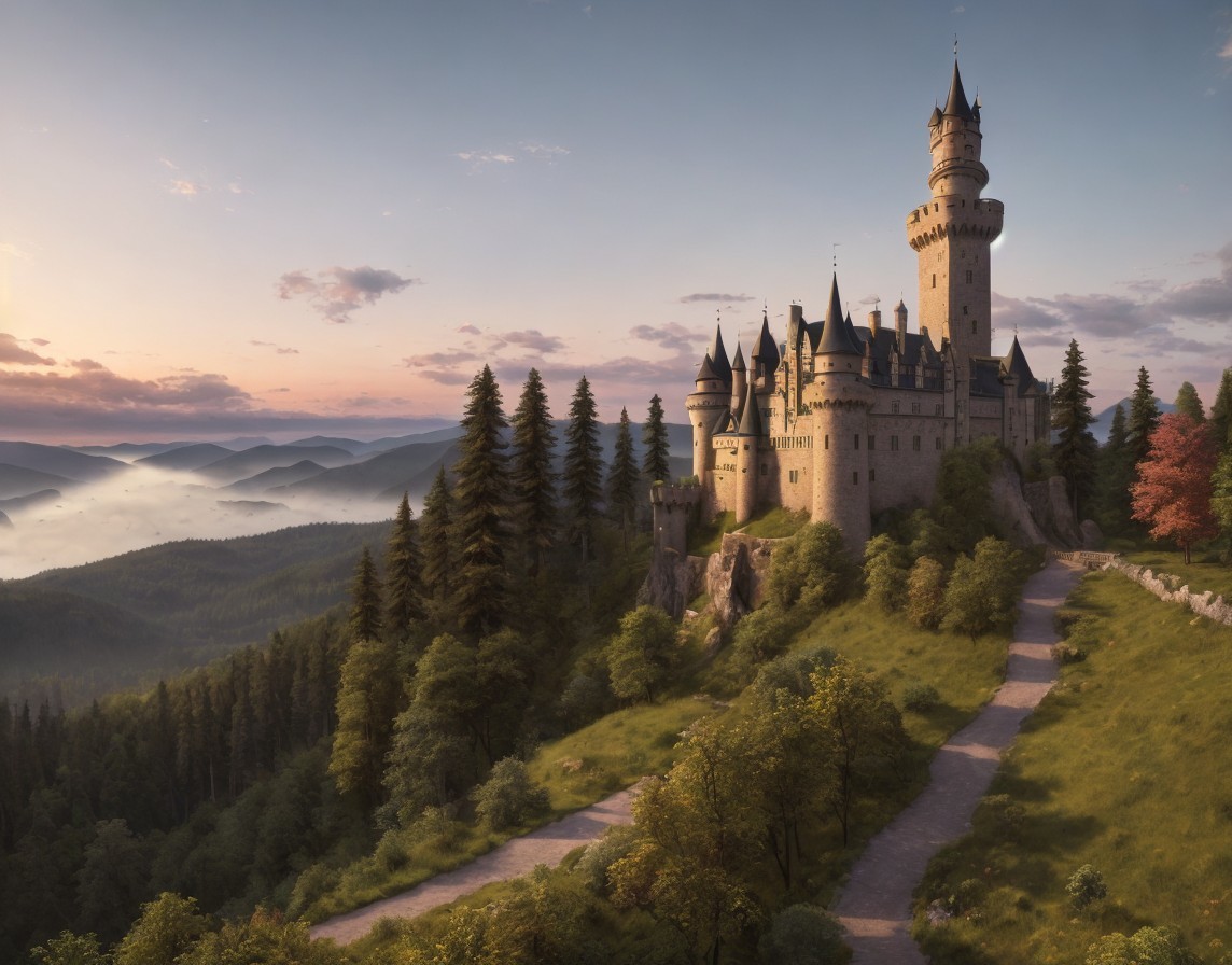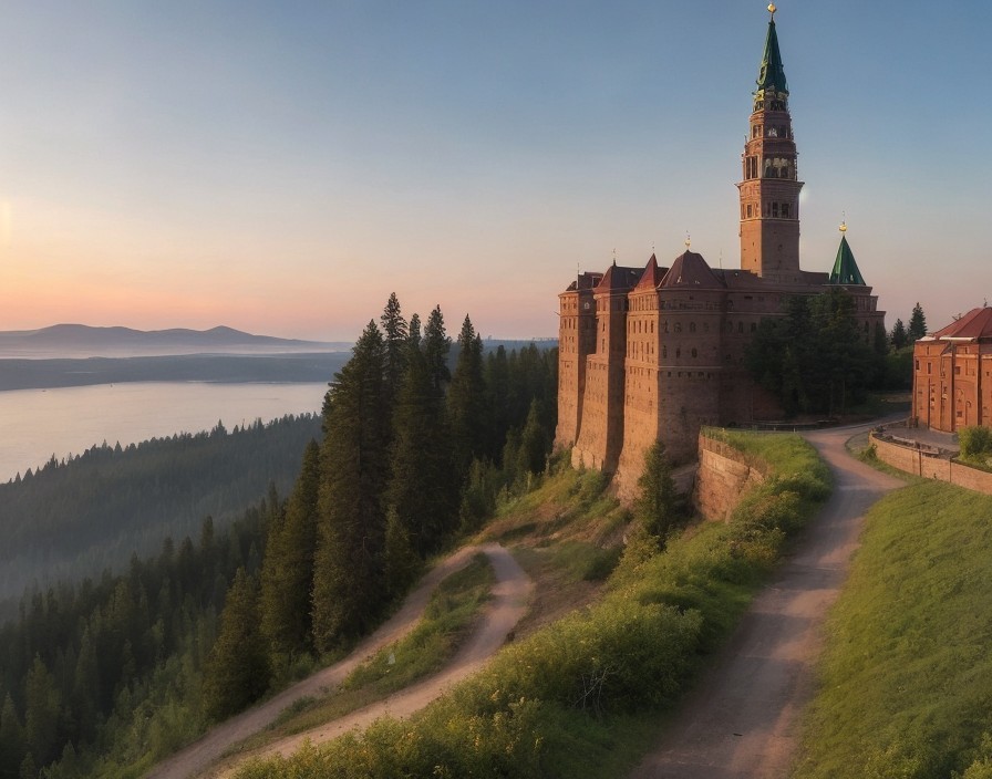 a castle on a slope, a panorama of a forest in a valley, a beautiful evening sky, leave pretty the same, but enhance quality