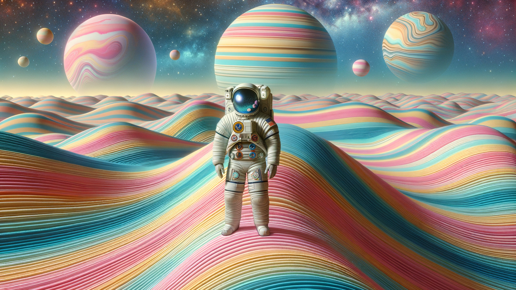 An astronaut in a white suit with blue, orange, red, and yellow circular patches stands on a landscape of pastel-striped rolling hills in shades of pink, yellow, blue, and orange. In the background, three large pastel-striped planets and two smaller ones float in a starry sky. The