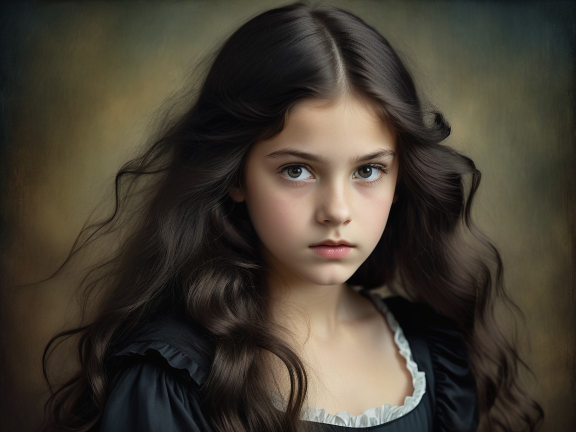 Prompt: "A old vintage-style photography art of a young girl with long, flowing dark hair and piercing eyes. She has a serious expression, conveying depth and emotion. The background is slightly blurred, enhancing her features. The girl is wearing a ruffled black dress, adding to the mysterious and ethereal atmosphere of the scene. Emotion by Hieronymus Bosch, Goya, Hussar, Gray, Beksinski, vibrant colors, gothic elements[Transfer & emulsion lifts, vertical translucent image, optical glitch anomalies, data bending, cracked analog errors, tintype-inspired portrait, extreme erroneous subsurface scattering; watercolor in glass, wrapped in stretched aluminum/latex membrane;]. The lighting is soft and moody, giving the image a vintage, timeless feel."