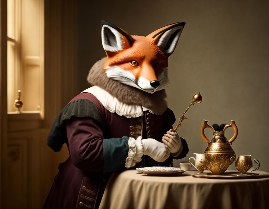 Anthropomorphic fox in historical attire with teapot and pipe at table.