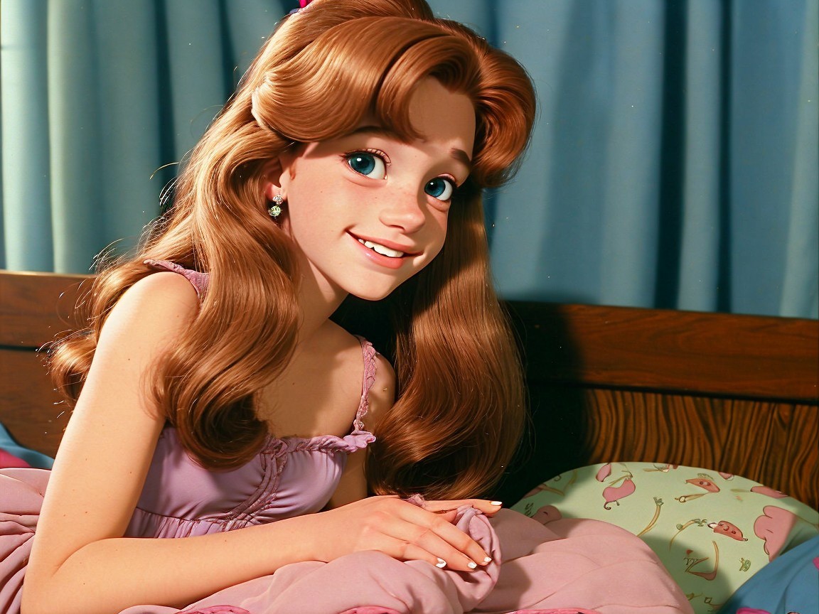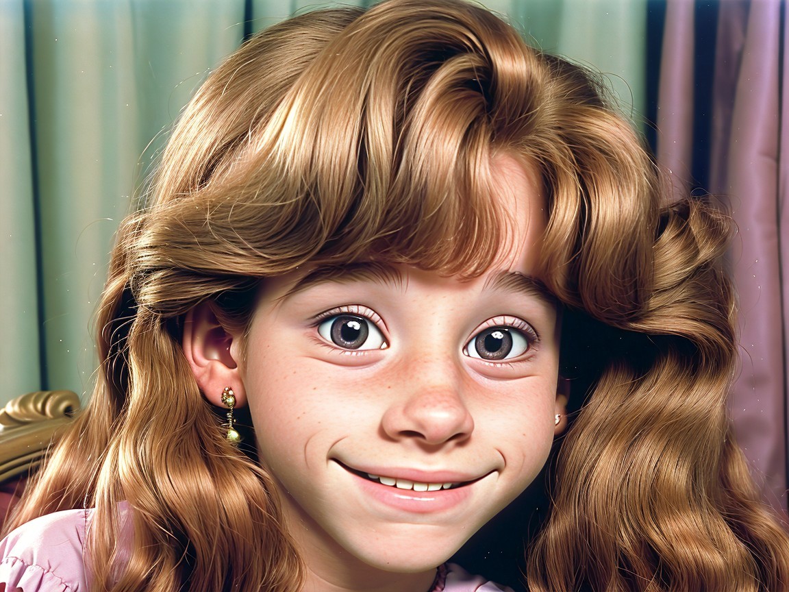 Cheerful young girl with curly hair and purple outfit