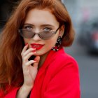 A woman with long, wavy red hair wears glasses and a stylish red blazer, seated at an outdoor café. The ambiance is vibrant with autumn leaves and people strolling in the blurred background.