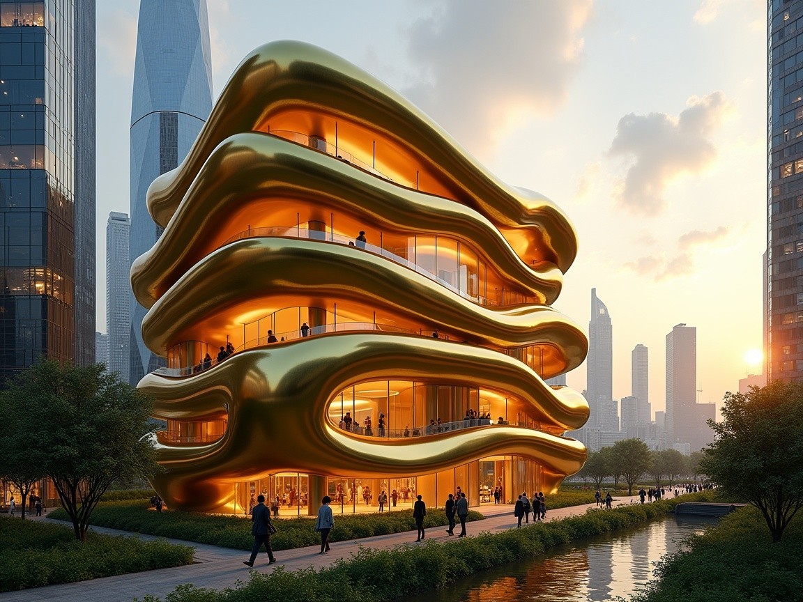 A modern, organic-shaped building with large, circular windows, surrounded by lush greenery. It stands beside a tranquil waterway, flanked by sleek skyscrapers and bustling pedestrians.