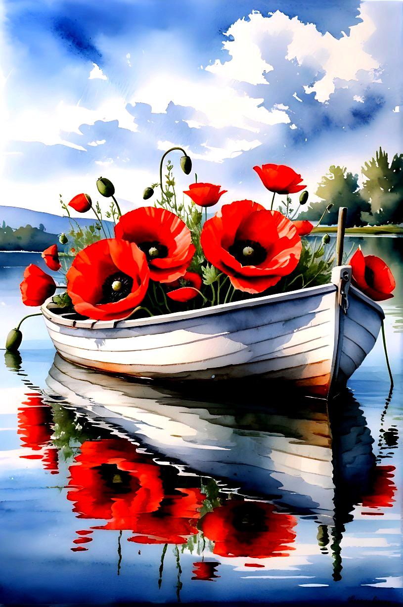 A serene watercolor scene depicts a small boat filled with vibrant red poppies, floating gently on a calm lake. The reflections and blue sky enhance the tranquil atmosphere.