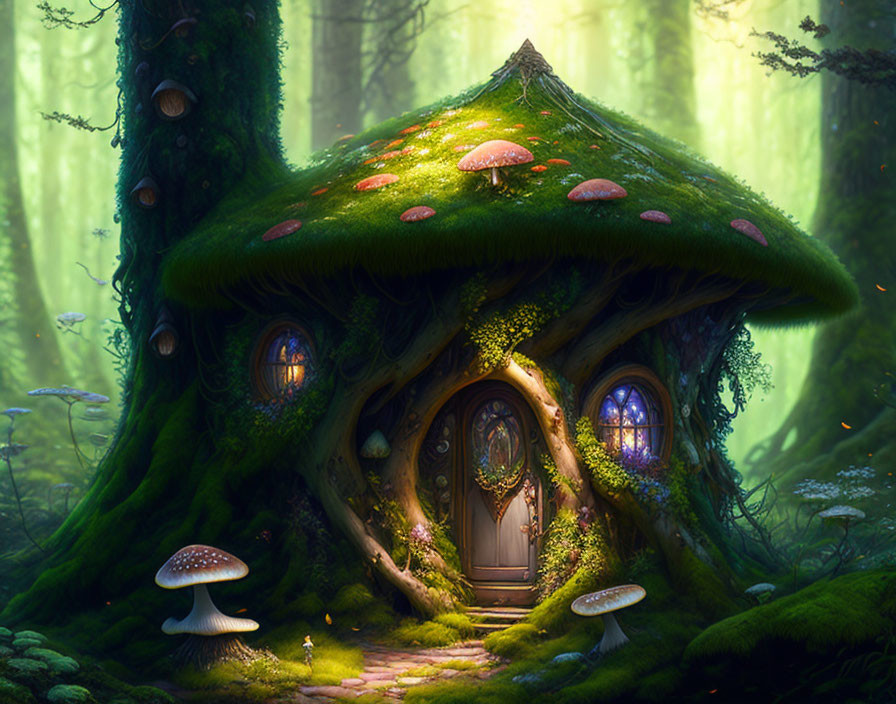Enchanting forest house with moss roof, glowing windows, and mushroom path