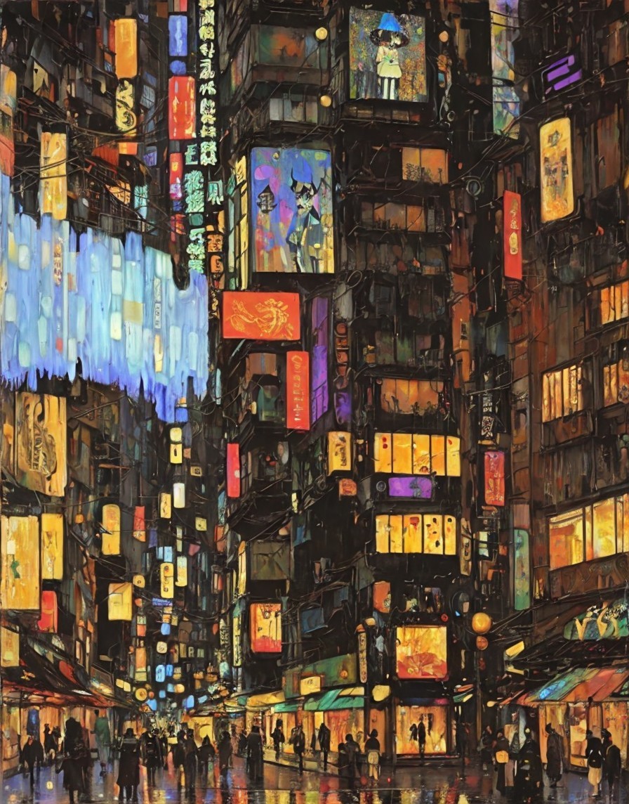 + Prompt:Gustav Klimt Degas oil acrylic on paper Art Deco image Marchesa Luisa Casati cyberpunk style Old Shanghai at night street scene Blade Runner cyborg bot