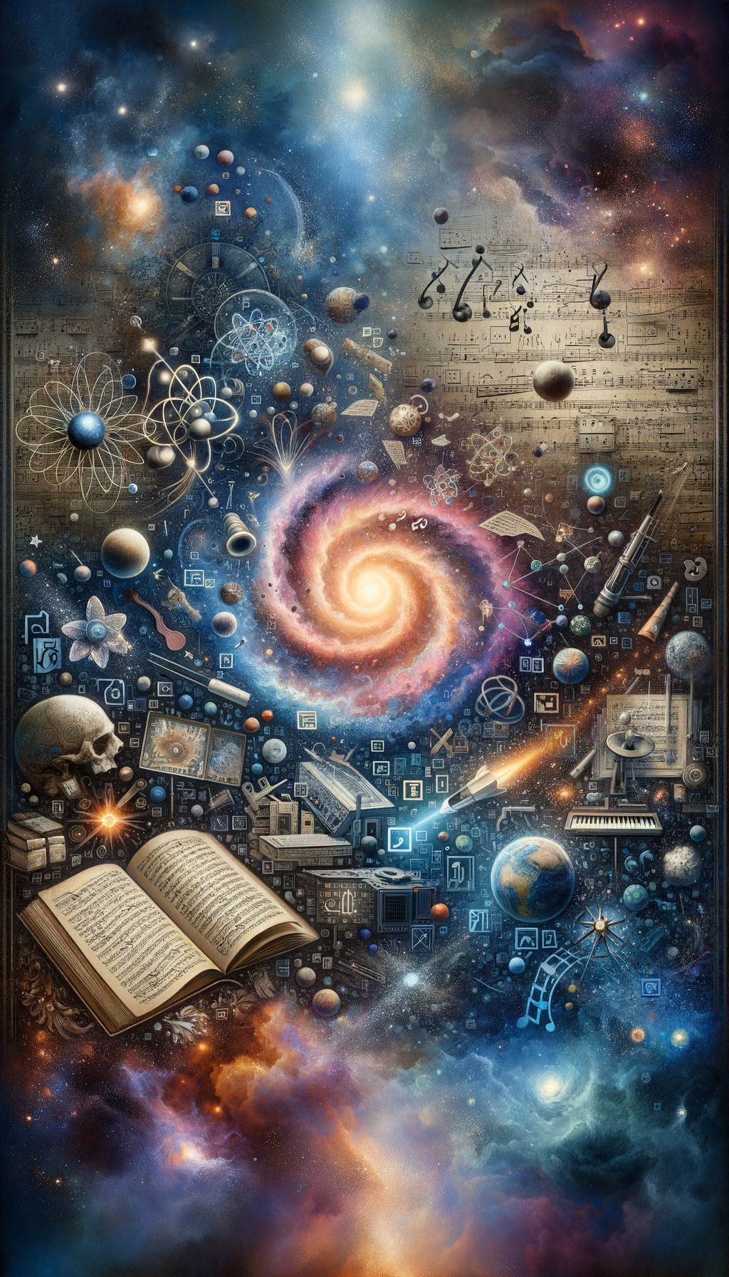 Prompt: "a visually rich collage that symbolizes the endless journey of intellectual discovery. The artwork should have a deep space backdrop, a visual metaphor for the continuous growth of knowledge. Intersperse throughout the scene various symbols signifying different fields of study: atoms for science, musical notes for arts, and motherboards and digital imagery for technology. These elements should blend seamlessly into the cosmic tableau, brimming with stars, galaxies, and nebulae to represent the vastness of the universe. Overlay this with imagery of ancient manuscripts, telescopes, floating mathematical equations, and an ever-expanding galaxy."