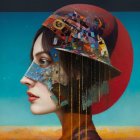 A surreal portrait of a woman, her profile highlighting a vibrant red backdrop. Intricate scenes of planets, buildings, and a rocket emerge from her head, symbolizing thoughts and dreams of exploration.