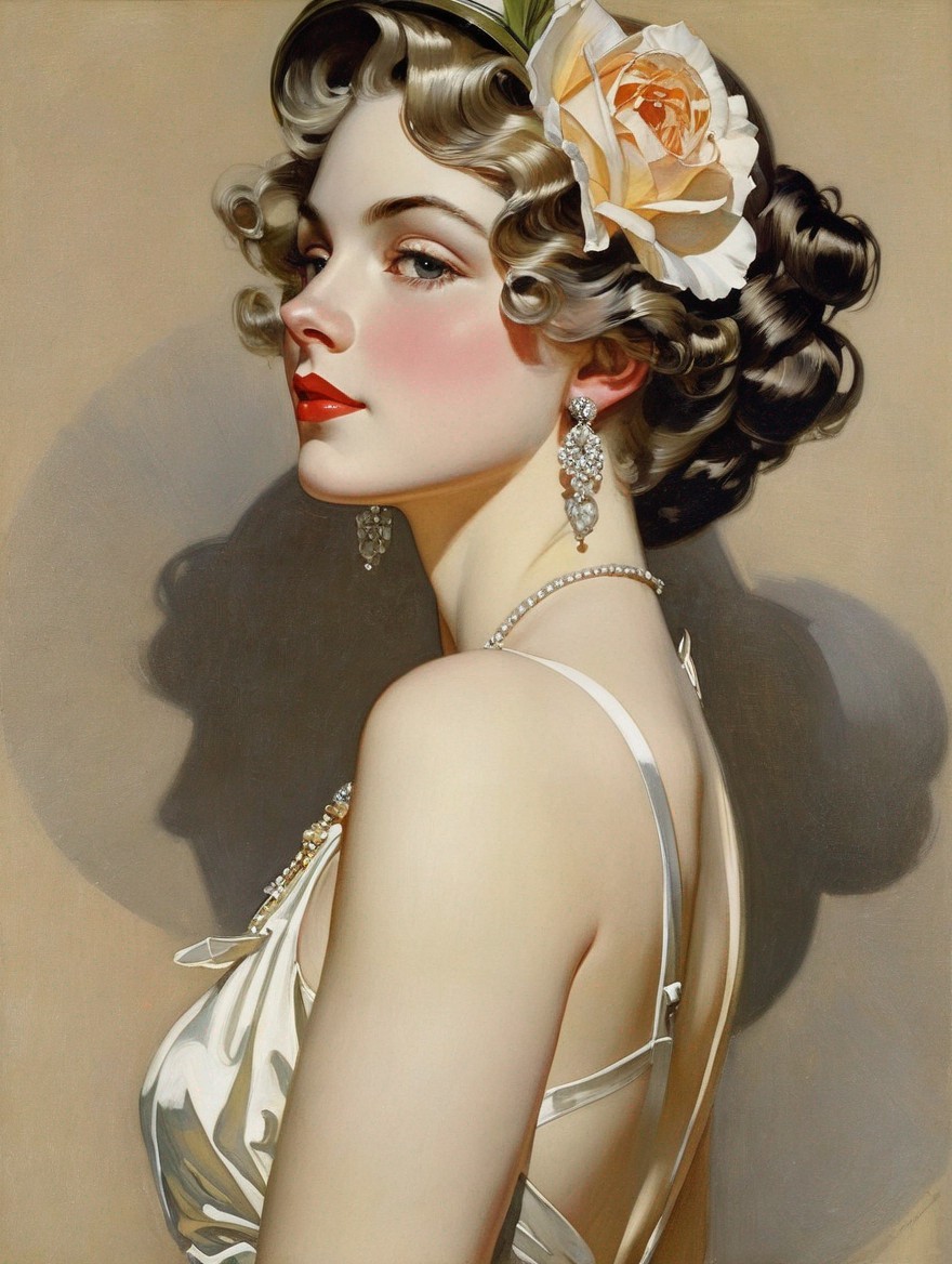 A surreal portrait with a woman, large moon, calm sea, and flying fish against a twilight sky.