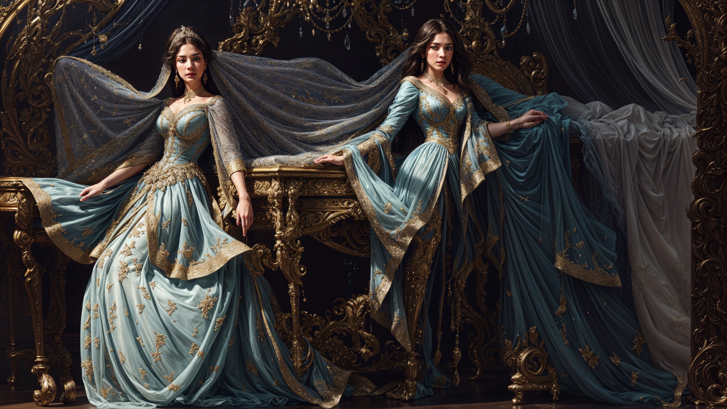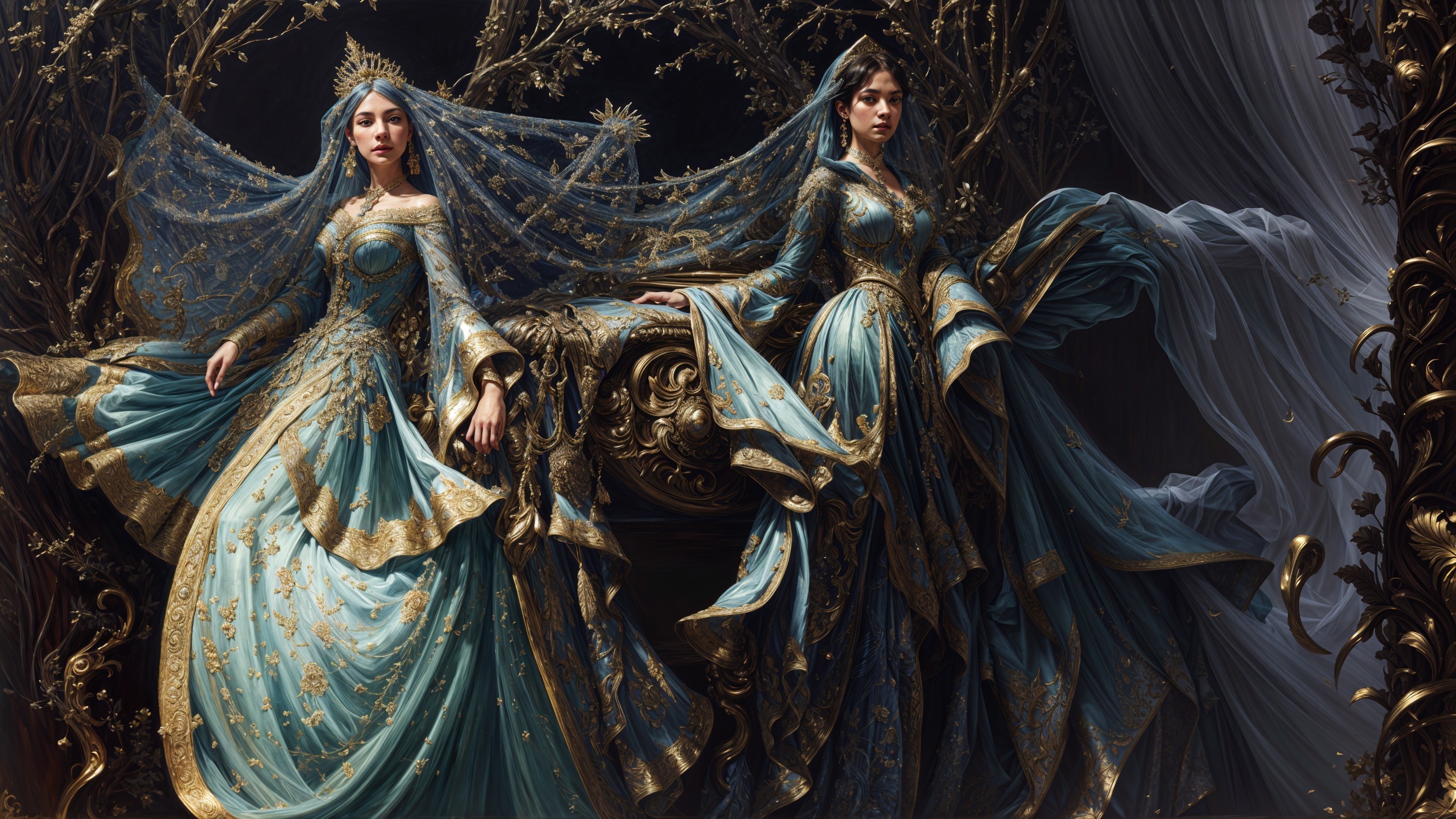 A serene scene depicting a woman in an elegant gown sitting beside a child in a dark outfit. They are surrounded by lush greenery and soft light filtering through, creating a tranquil atmosphere.