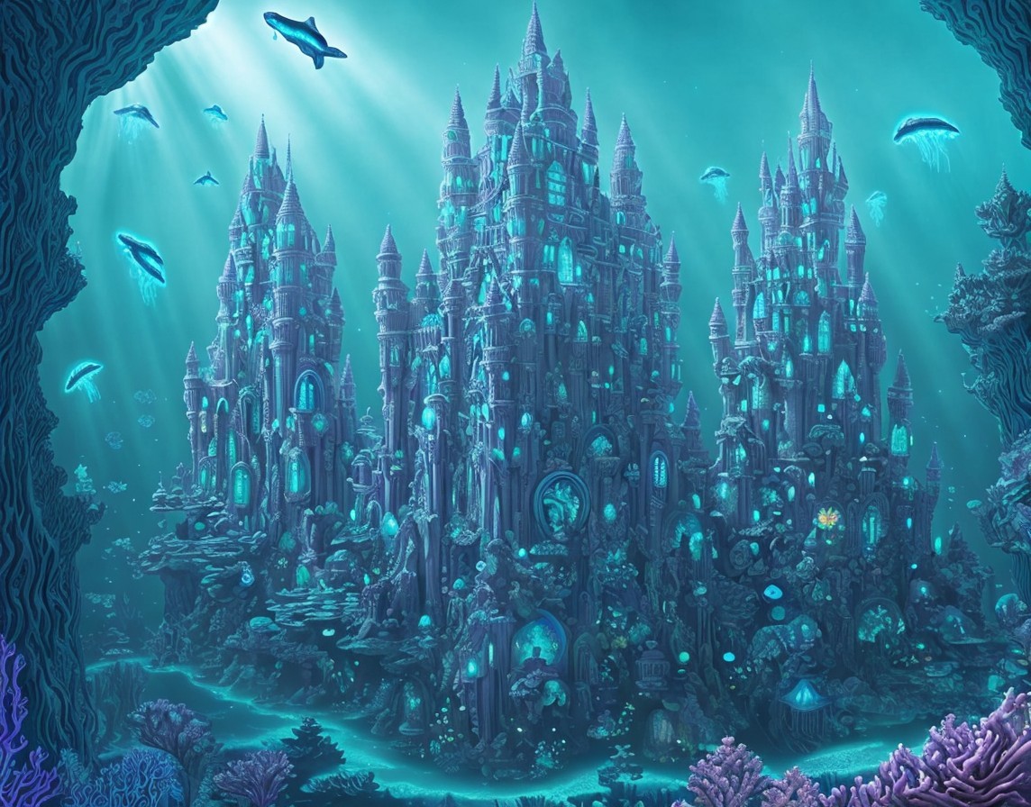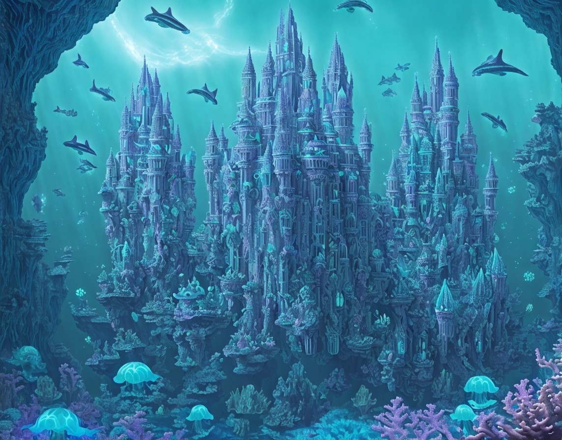 + Prompt:Castles in Underwater city, Atlantis, bioluminescent jellyfish in mystical underwater kingdom. Vast intricate deep sea city. Extraterrestrial bioluminescent jellyfish surrounded by glowing coral reef with intricate geometric patterns. Manta rays, whales, sharks, fish and stingrays swimming around underwater castle. Ultra-realistic landscape. Astral projection, alien contact, and surreal psychedelic vibes inspired by the sci-fi LSD art aesthetic. In the style of Cameron Gray