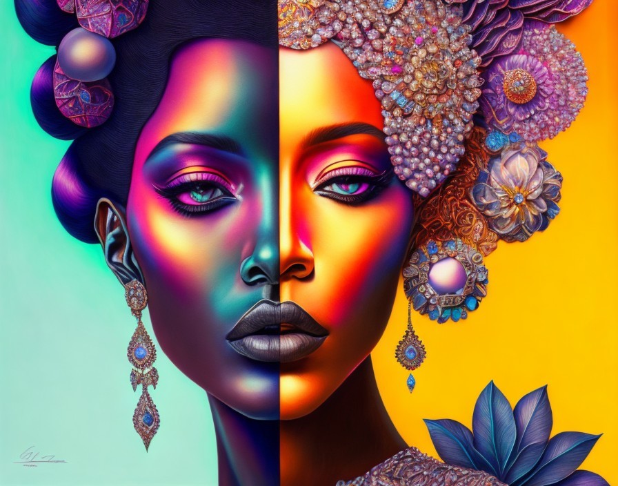 Colorful digital art of a woman with vibrant makeup and adorned with flowers and jewels. Two different color palettes, each half mirroring the other.