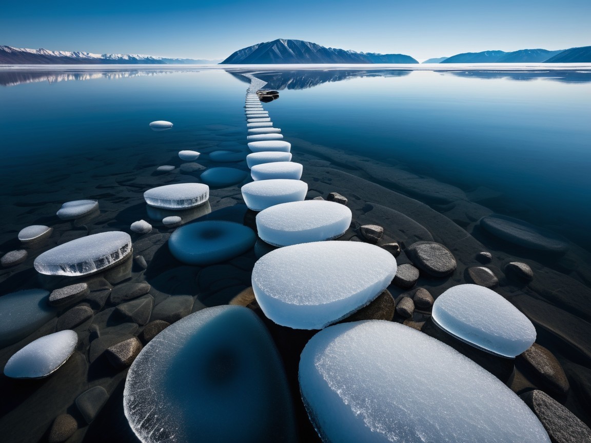 The image showcases serene blue icebergs floating on calm waters, surrounded by a mountainous landscape. The crystal-clear ice formations create a striking visual contrast against the tranquil surface.