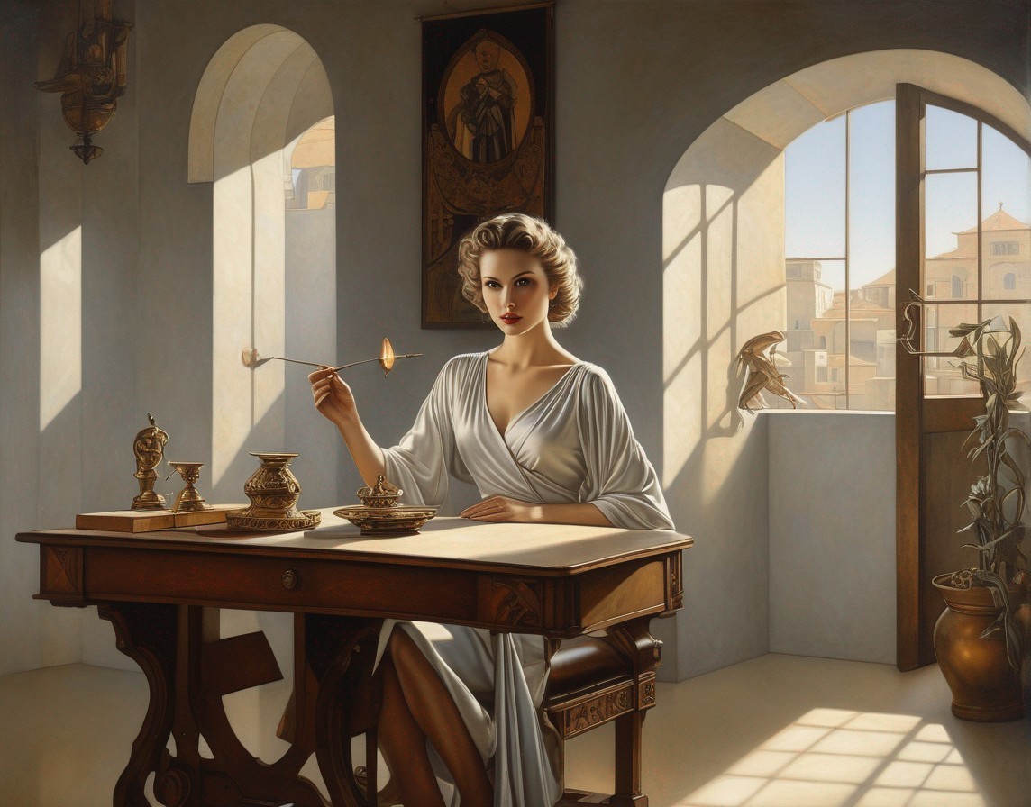A woman in historical attire ponders while sitting at a desk with books in a sunlit, classical room, showcasing intricate architecture.