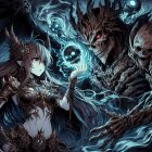 Regal Woman and Skeletal Figure in Fantasy Scene
