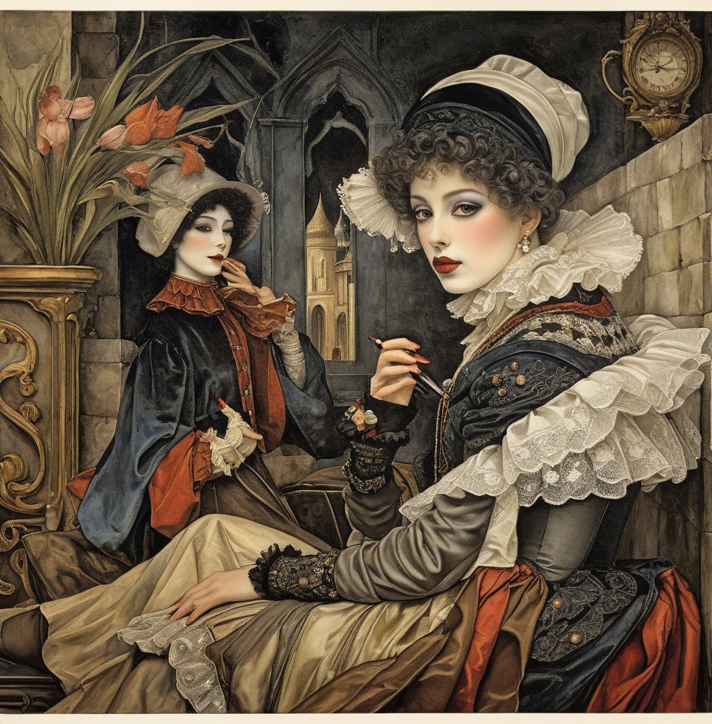 The image features two elegantly dressed women in historic costumes, showcasing intricate details. One holds a mirror, while both have striking makeup and elaborate hairstyles, exuding sophistication.