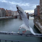 A vibrant, dreamlike scene depicts an owl soaring over a serene river lined with charming houses and colorful trees, reflecting hues of blue, orange, and pink under a whimsical sky.