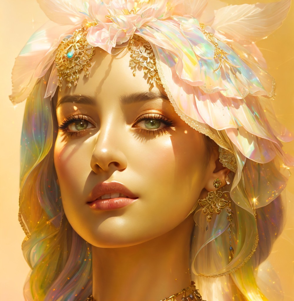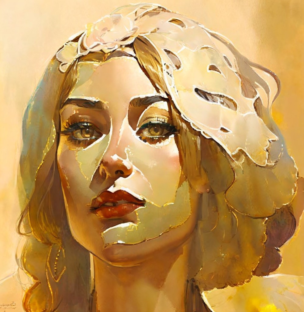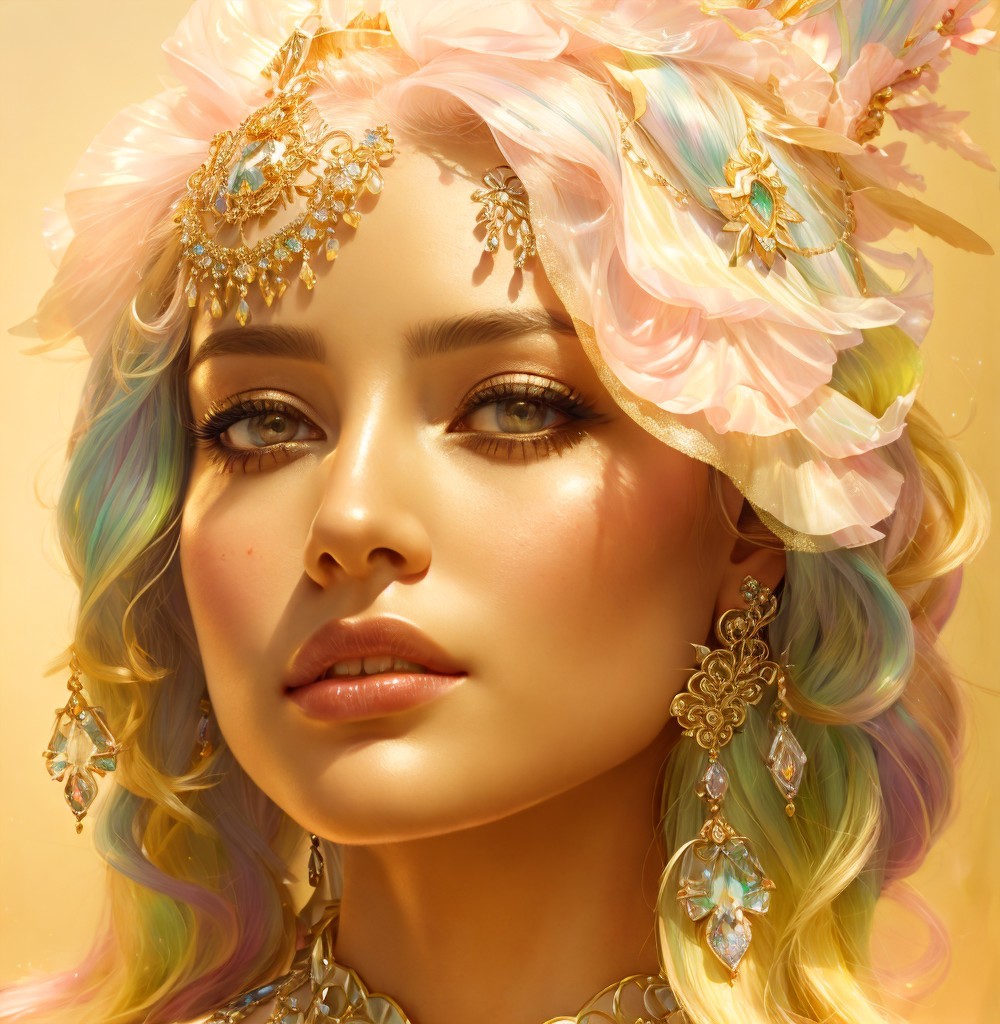 Gouache portraiture, Headshot, female enchantress, line-art hairstyle, silk contraptions, transparent frilly details, detailed intricate glossy lips, collar, jewelry, hairstyle detailed with wavery brushed watercolor painture, coronet, hues, metallic jewellery, highly detailed ornamental features, octane render, inkpunk 1.8, ambient occlusion 1.5, anisotropic filtering 1.2, raytraced shadows 1.2, heretic, traumacore 1.2, american gothic 1.7, beautiful composition 1.9, Light Yellow beige color scheme, perfect handsface, zentangle, biomechanical details, gothic horror essence, psychedelic iridescence, cubistic essence, sketchbook fantasy art, tints of comic book art, Vintage ornate, realistic, synthetic, minimalist female fashion model, tiny lines, abstract brushstroke art, stylized background, chipped texture, volumetric dynamic lighting 1.7, shadow mapping 1.3, translucent details, brightness 1.9,  Steampunk, blonde & pink hair, gothic grotesquerie, dreamscape, high definition, accent lighting, contrasted with soft delicate colors, flamboyant coloring, octane render illustration 1.5, movie poster art merged with storybook illustration style,