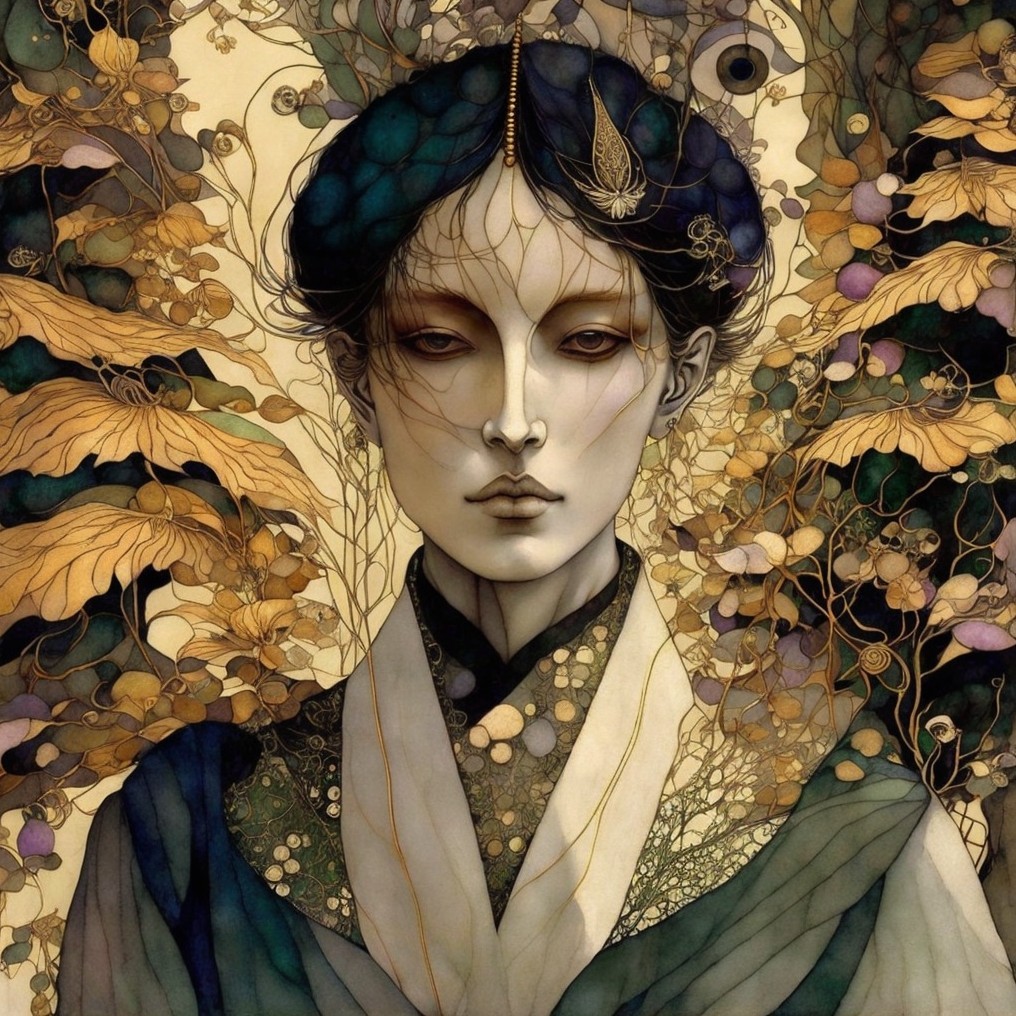 A portrait of a woman with intricate golden wings, reminiscent of a fairy, adorning an elegant green dress and ornate jewelry.