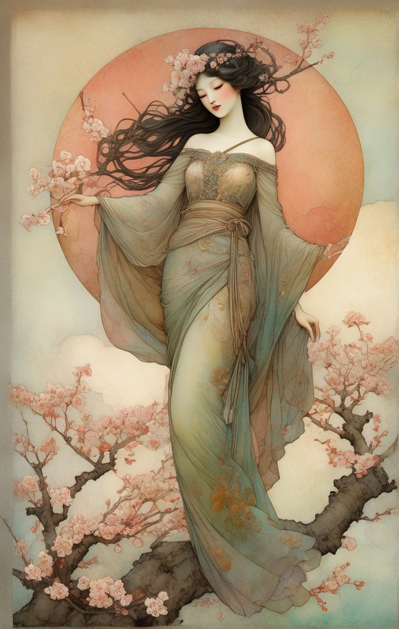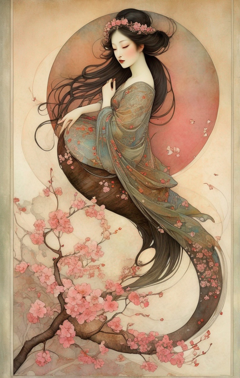 + Prompt:. Kraneia is a beautiful hamadryad that inhabits cherry trees. Cherry tree is in full flower. Iridescent watercolor and ink By Jamie Heiden, Daniel Merriam, Paul Klee, Karol Bak, Dee Nickerson, extremely detailed, high definition, crisp quality, ultra detailed background art nouveau