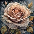 A beautifully detailed rose with soft beige petals, elegantly highlighted with gold accents. Its lush leaves and a delicate bud add to the floral composition against a dark, moody background.