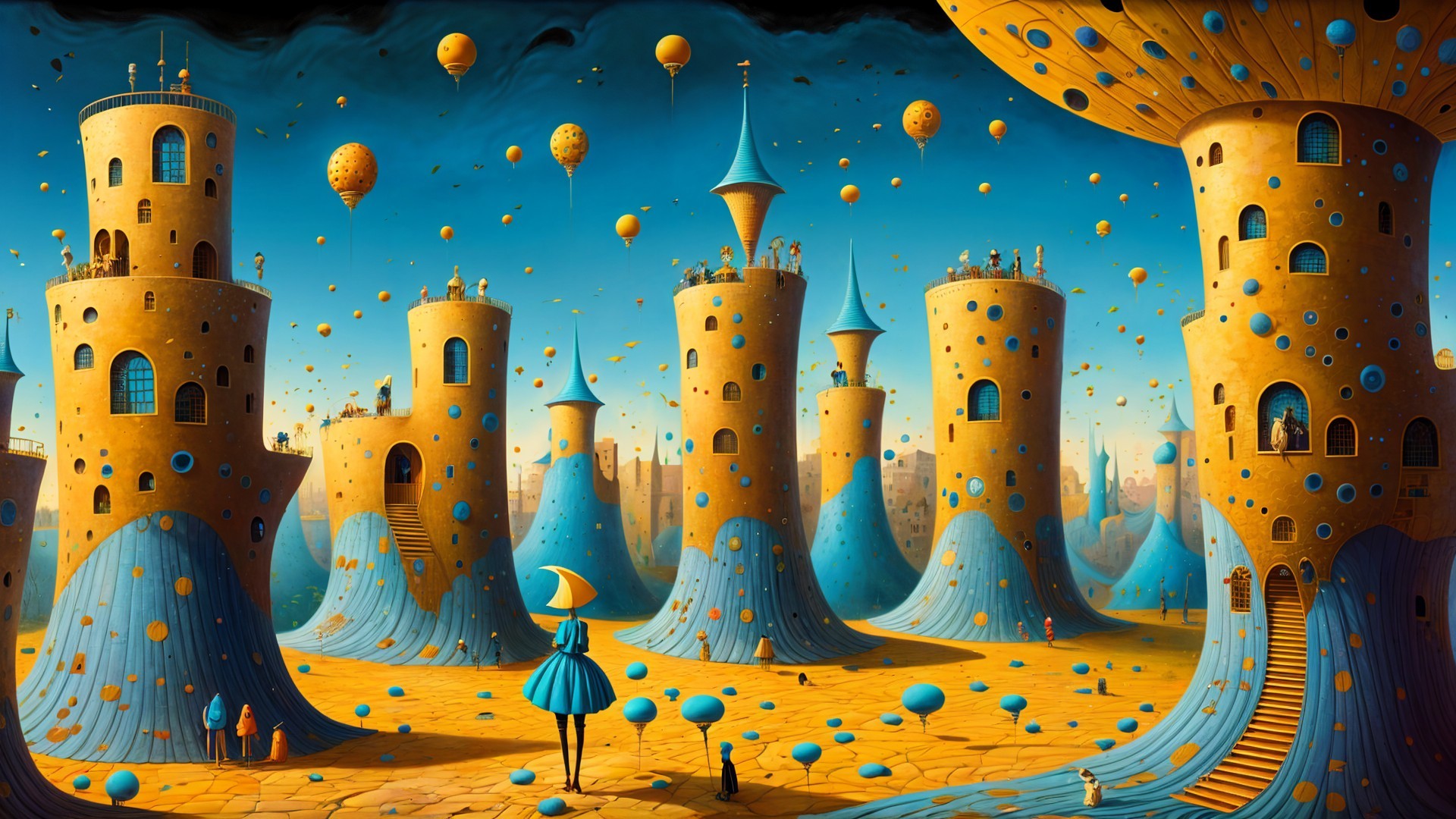 A whimsical landscape features brightly colored, cone-shaped towers under a sky filled with hot air balloons. A girl in a blue dress holds an umbrella, surrounded by playful scenes.