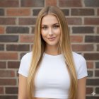A young woman with long blonde hair smiles warmly against a backdrop of rustic brick walls. She wears a simple white tank top, exuding a cheerful and approachable vibe.
