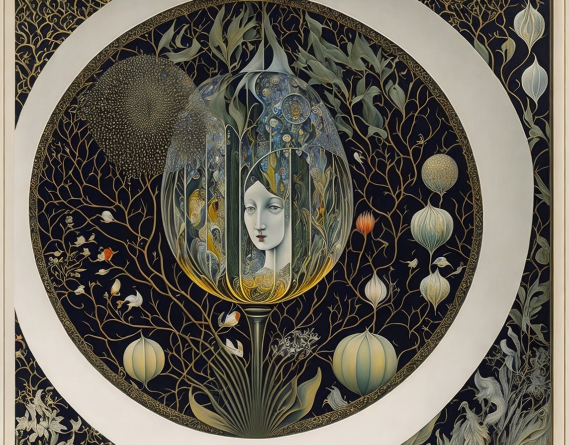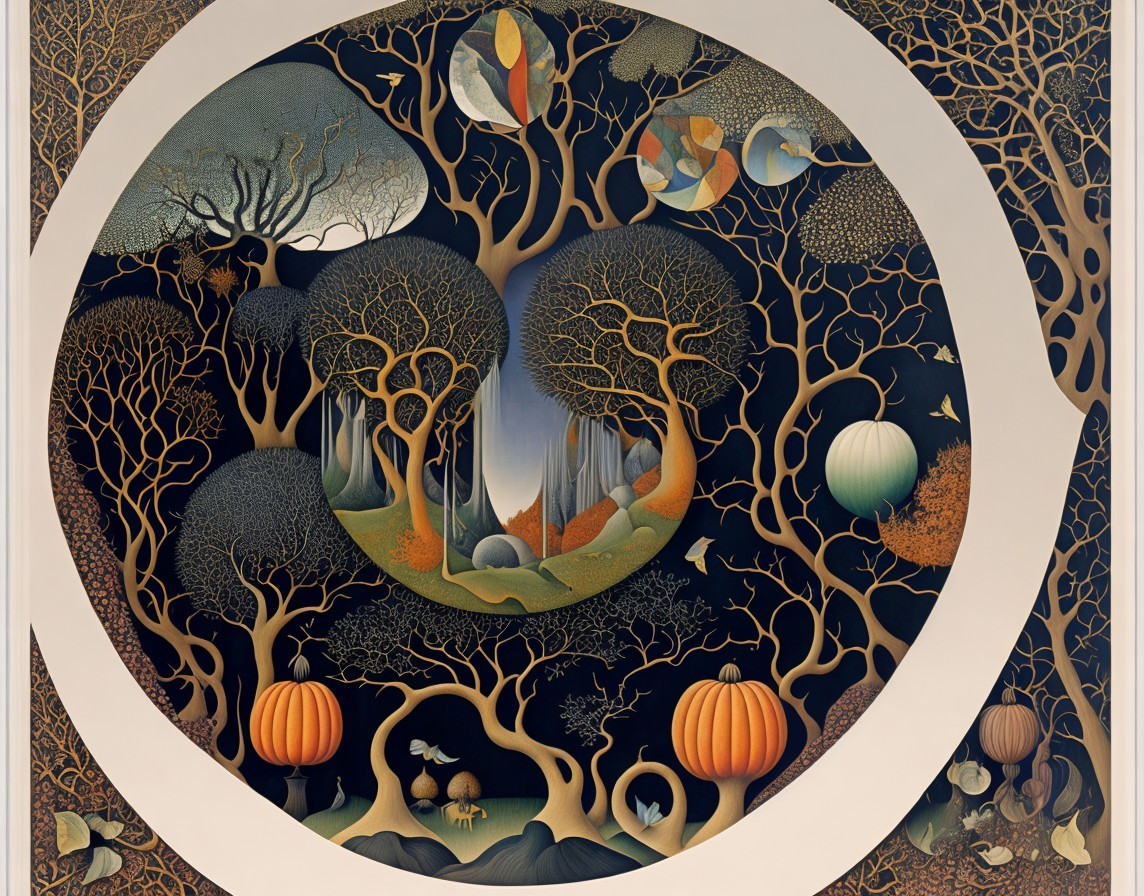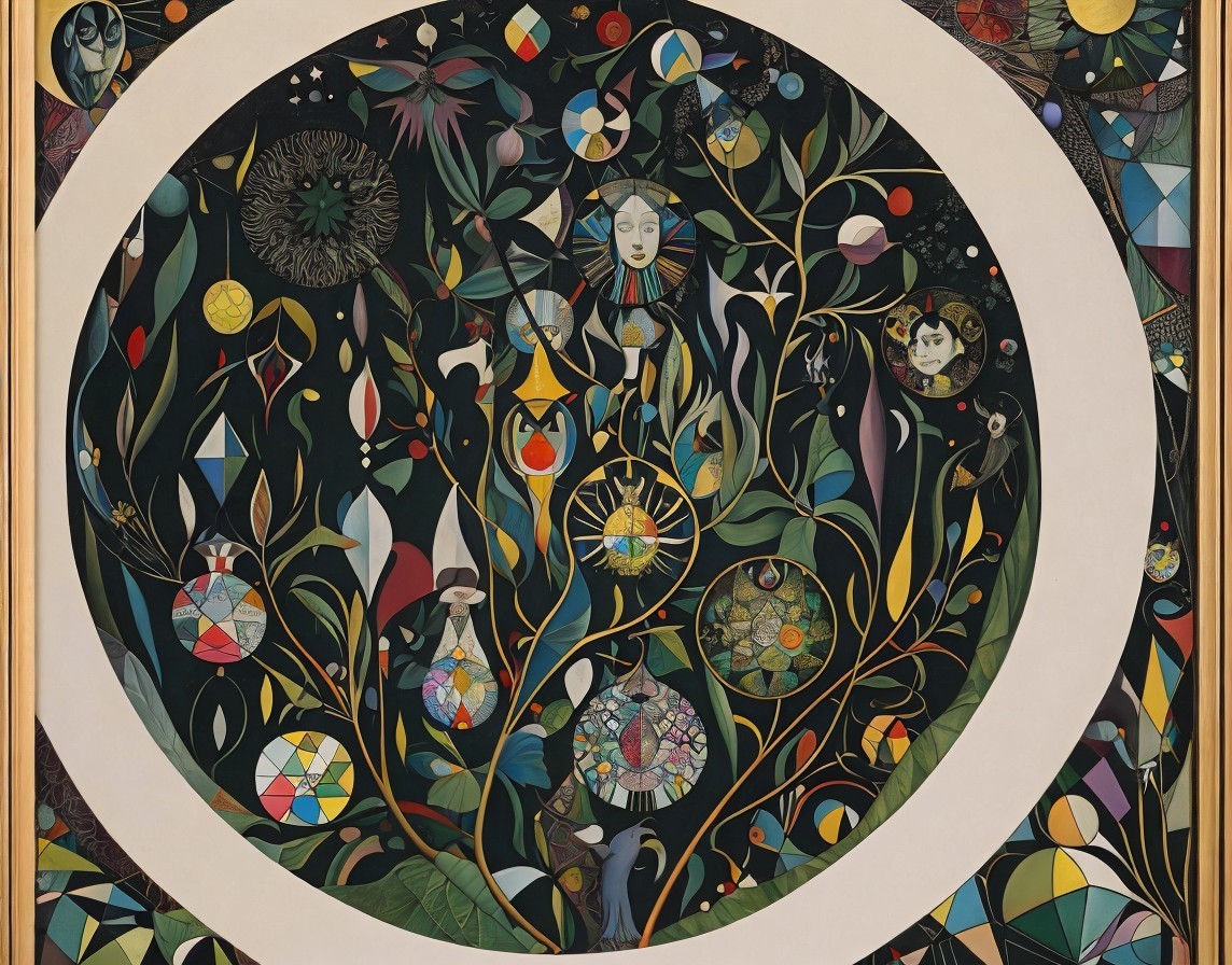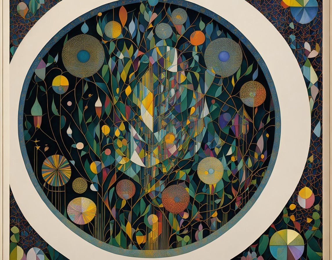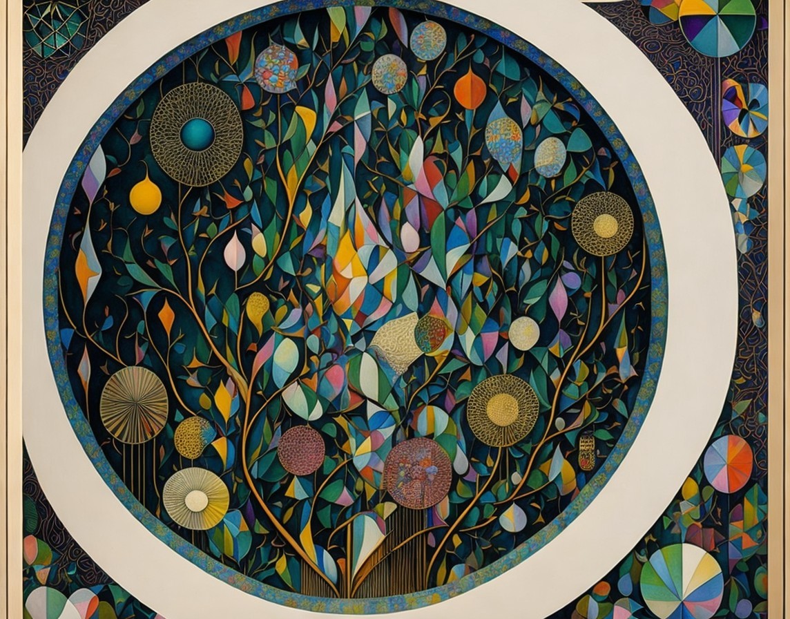 An intricate, colorful geometric pattern with tree motifs and circular designs against a dark backdrop, framed by a white border.