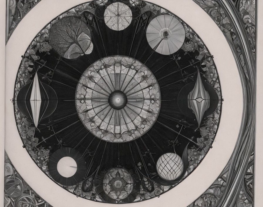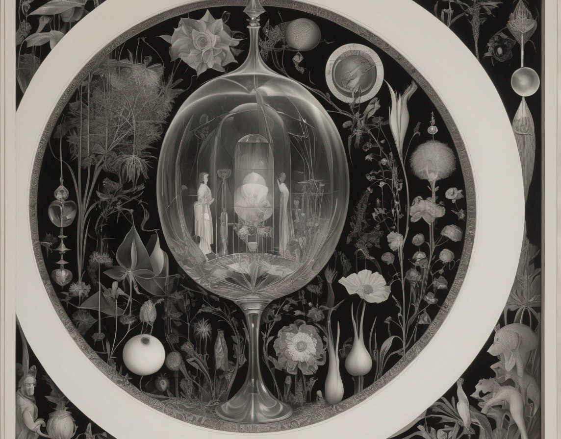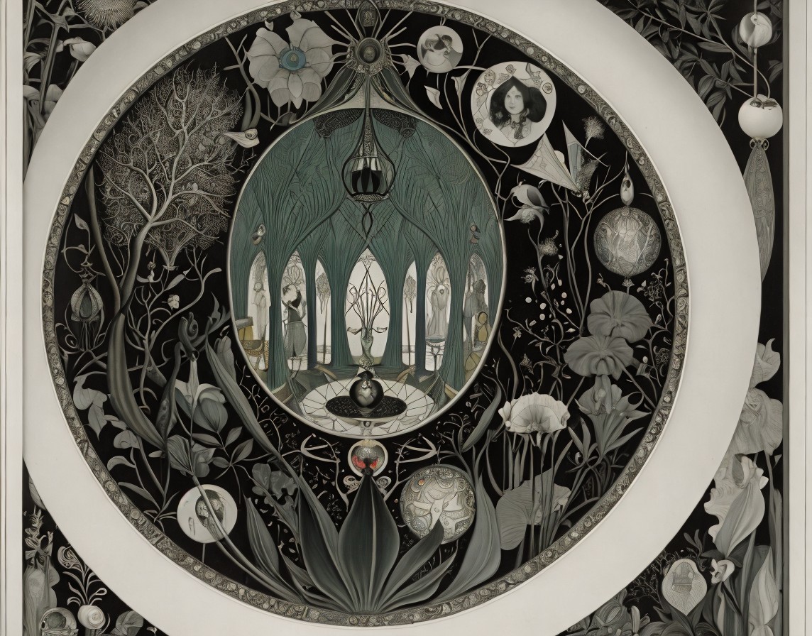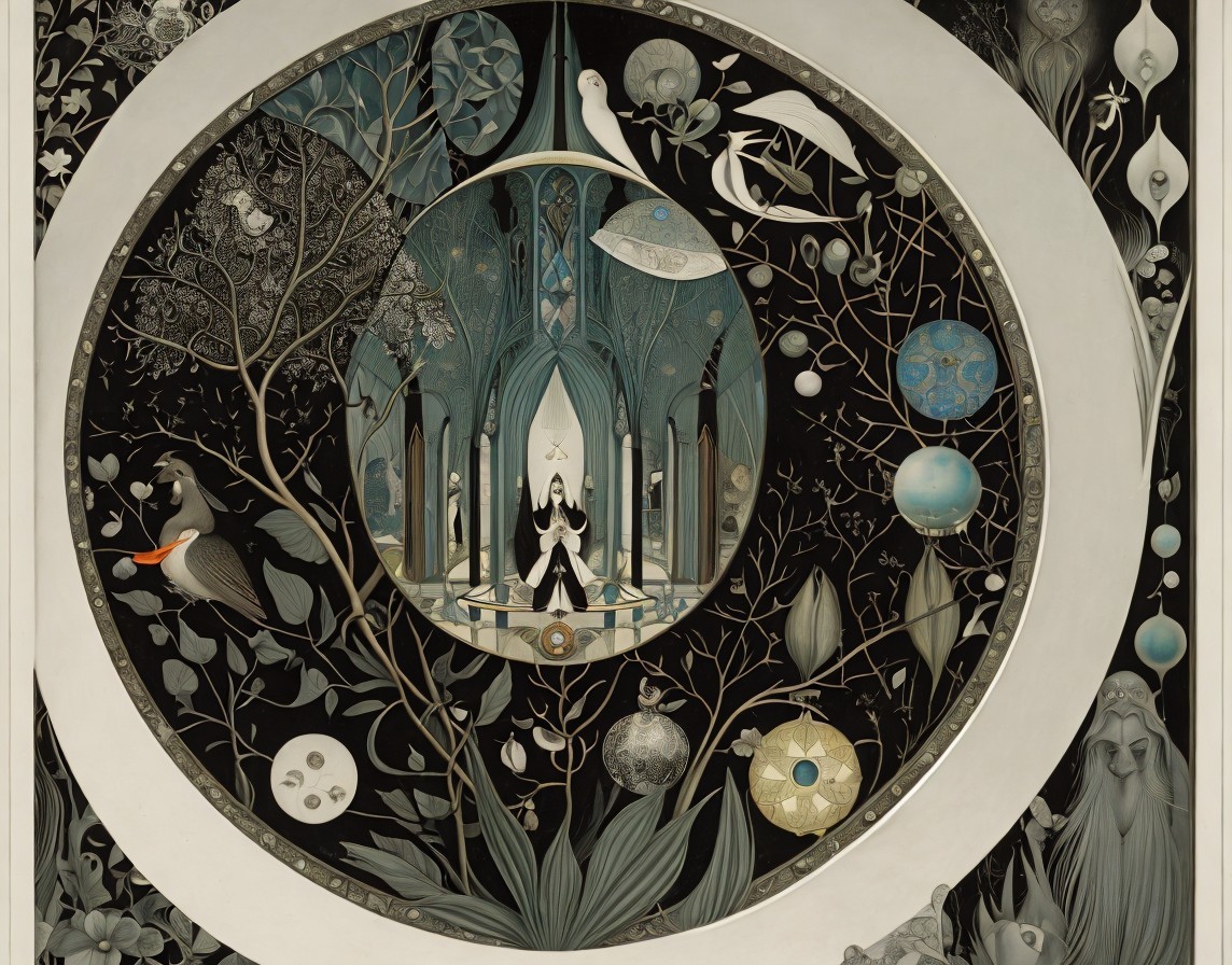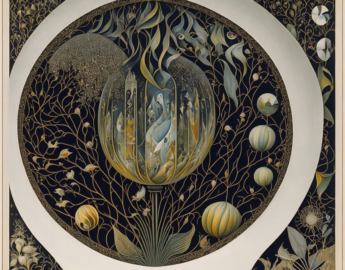 An intricate, colorful geometric pattern with tree motifs and circular designs against a dark backdrop, framed by a white border.