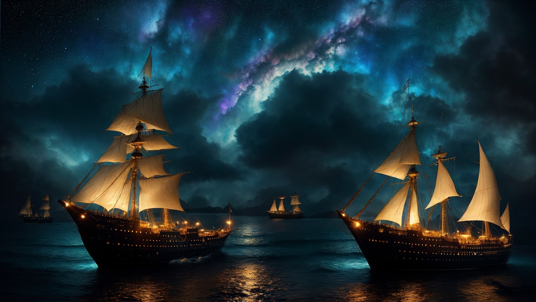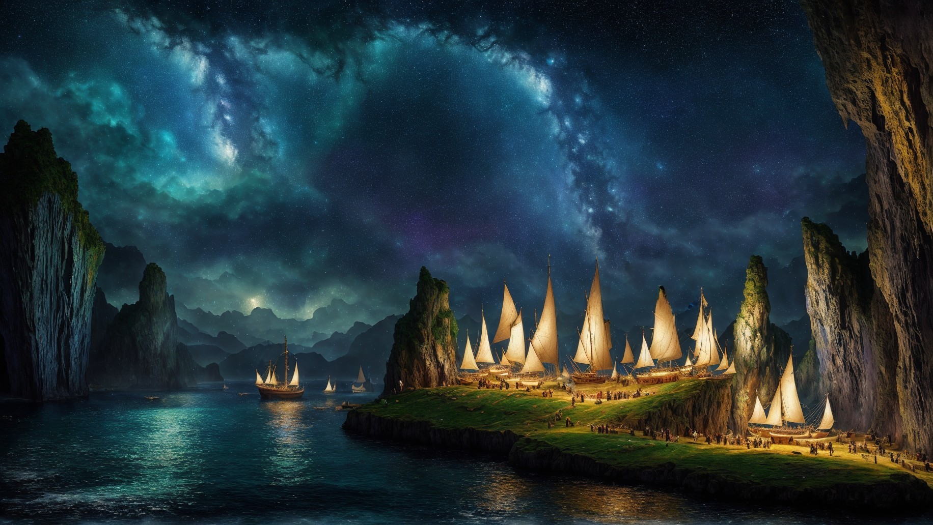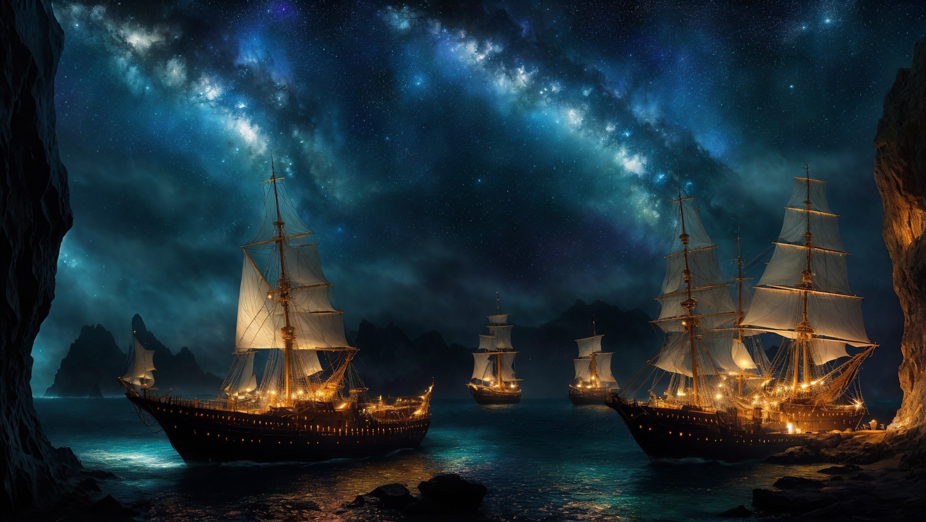 A magical cave illuminated by starlight featuring sailing ships on tranquil waters.