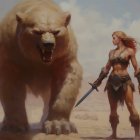 A fierce warrior woman stands confidently with a sword and shield, flanked by two massive bears. She wears rugged armor, embodying strength and bravery in a dramatic, wilderness setting.