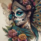 A stunning woman adorned with vibrant blue face paint, intricate jewelry, and colorful feathers. Her look is completed with floral accents, exuding a captivating, artistic essence.