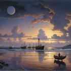 A woman in a gray dress stands on a beach, gazing at a dramatic sunset reflected in the water. Majestic clouds and celestial bodies fill the sky, creating a surreal, dreamlike atmosphere.