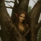 A whimsical forest fairy peeks out from behind a moss-covered tree. She has flowing hair adorned with leaves, delicate ear-like features, and a joyful smile, embodying the magic of nature.