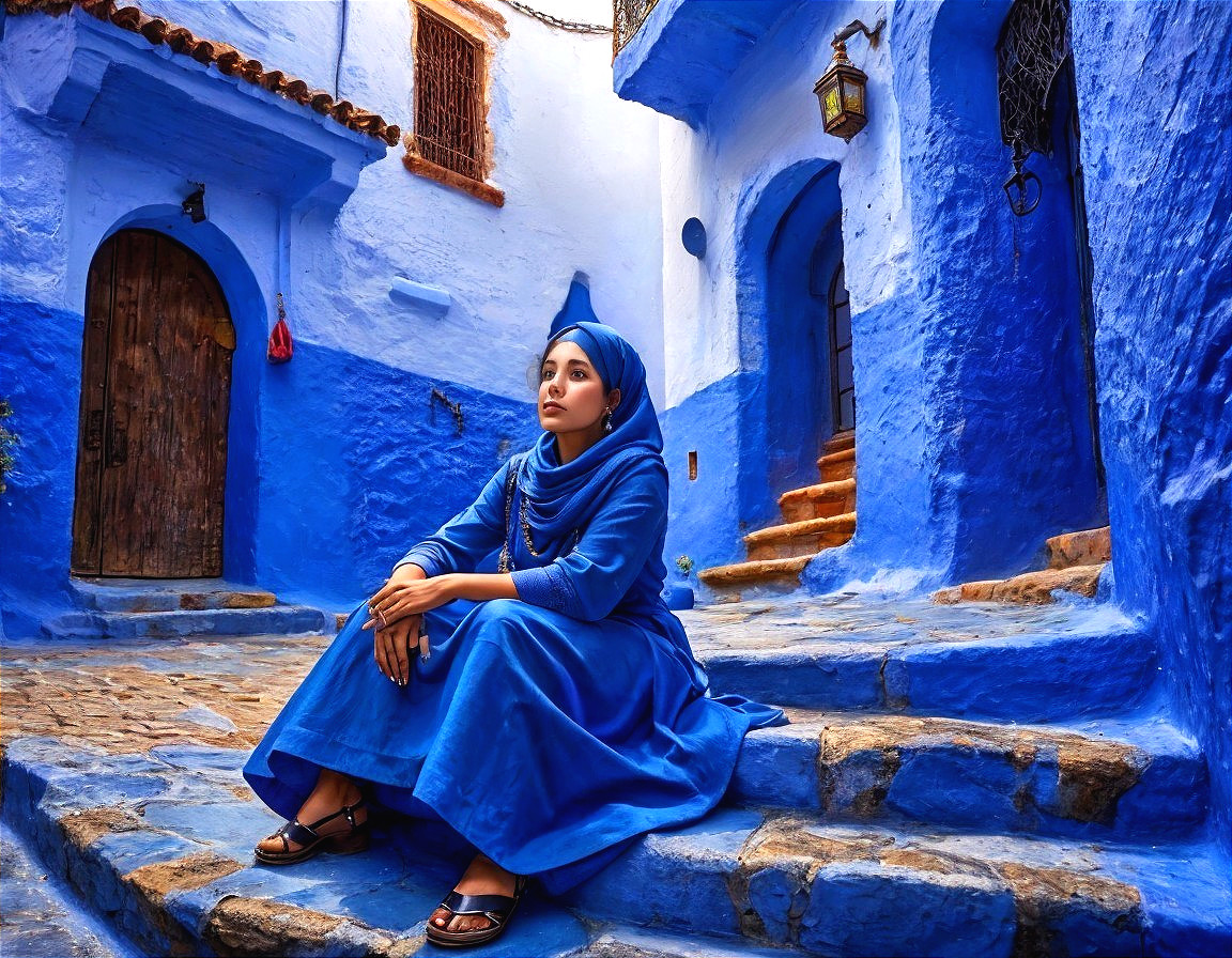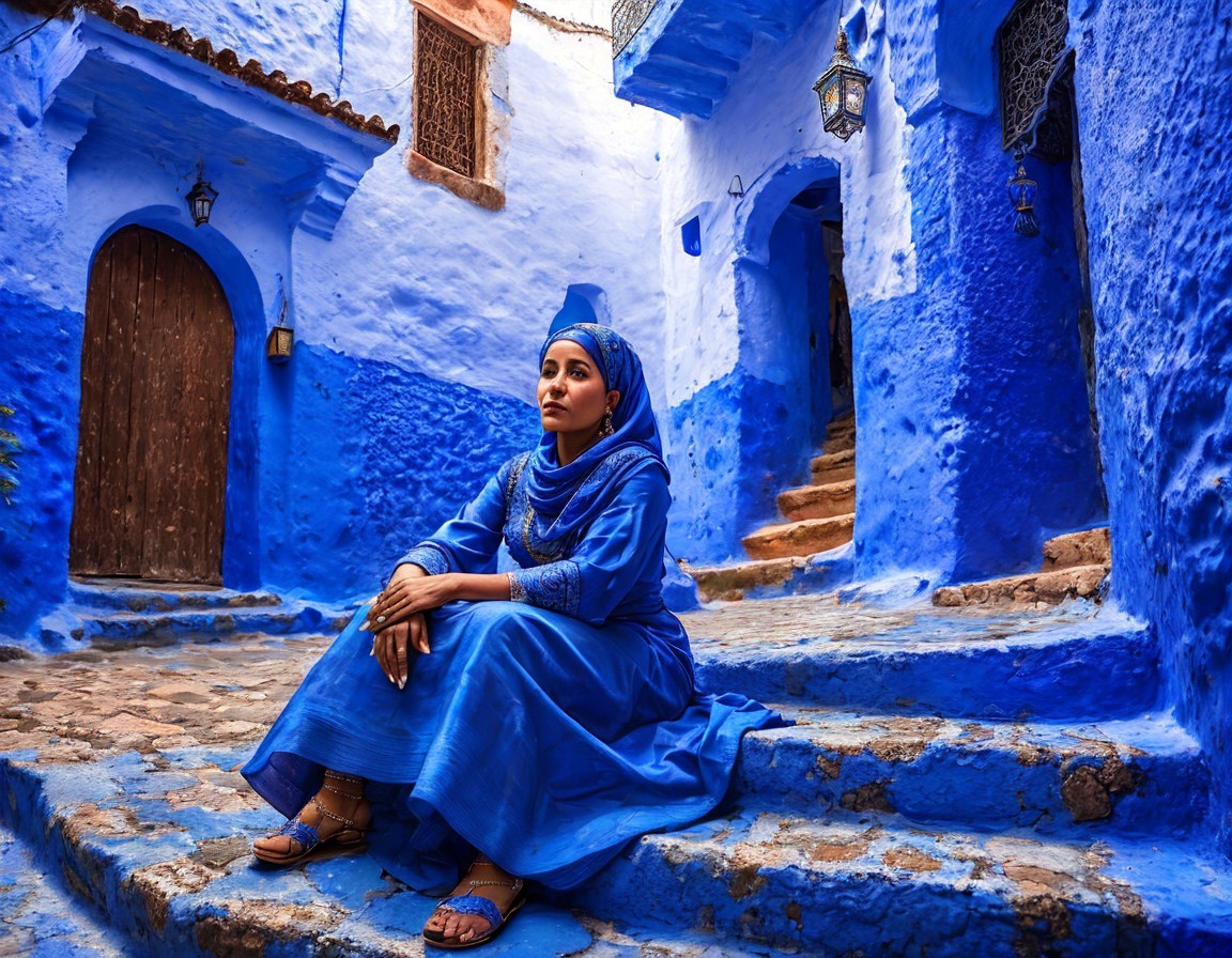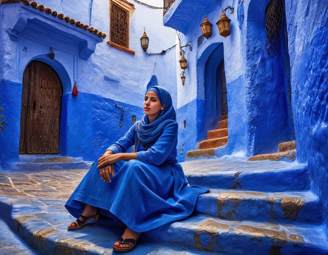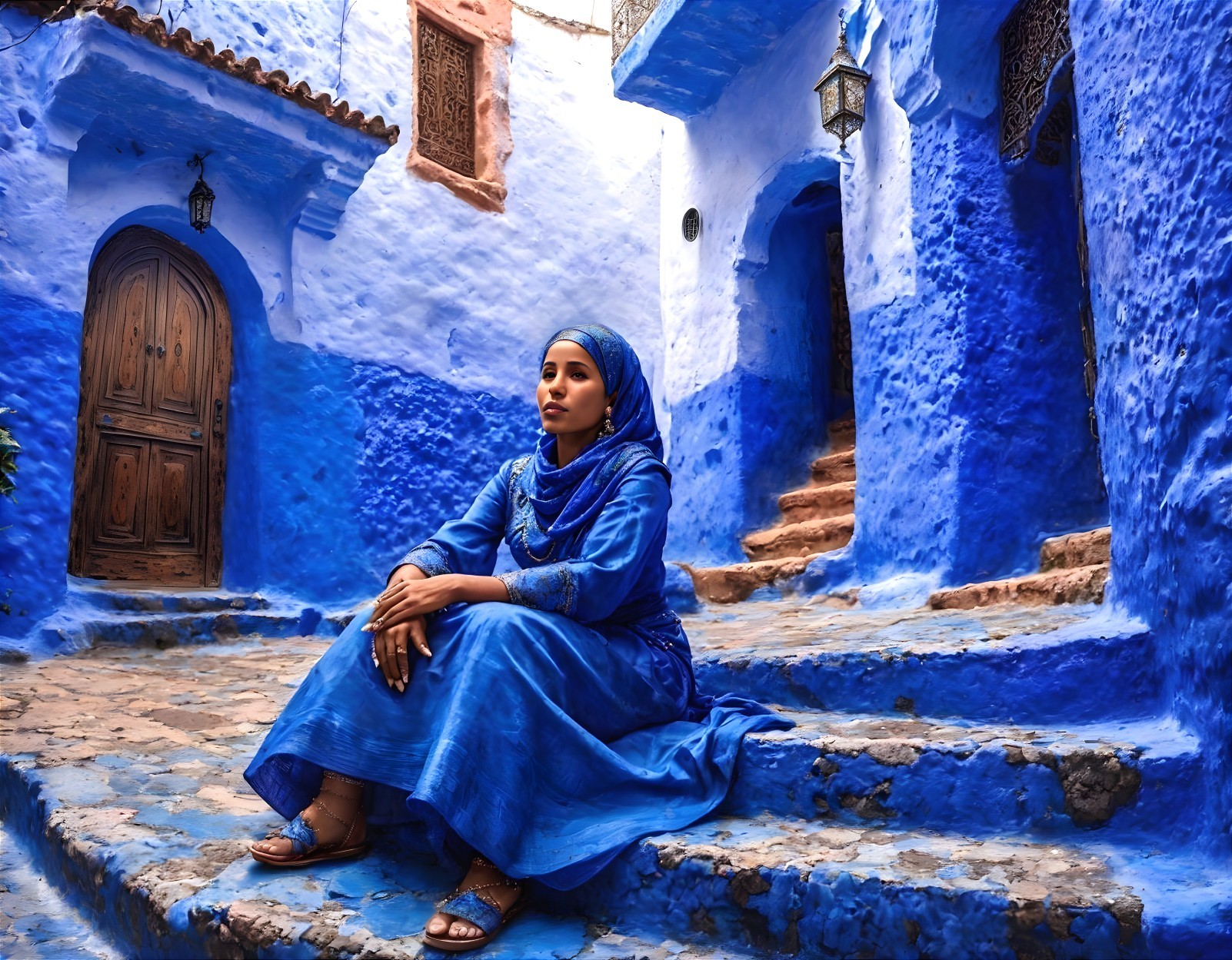 (Try it from Estrela) - A woman in blue sits on steps in a vibrant blue alleyway, with traditional architecture and a wooden door behind her.