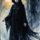 Prompt: A hauntingly ethereal watercolor sketch, full body portrait of a estranged juvenile female, blending ominous and fantastical elements in a dreamlike setting. Infused with rimmed foggy lighting, intricate pen and ink details, watercolor diffusion, crackles, contraptions, nacre, sequins, beads, enlarged black hat akin to stetson form, chiseled facial features & multi-layered eyes, closeup, hyper detailed & intricate, rim lighting, balanced embodiment proportions, alluring, gothical, fantastical, op-art, mysterious & modern, natural anatomy proportion, internally detailed & decorative, transcendent,, elegant, graphic art, kinetic art, editorial, assemblage art, fractured canvas, otherworldly, detailed magic, realistic & abstract, dark & magical realism, designed textile 3d patchwork and sawtooth wave, Negative Lucas numbers, Digital topology, LiDAR point cloud, 128K, UHD, HDR,,hyper-realistic symmetrical chiseled facial features, full body depicted, textured glossy shimmering effects, metallic colors for a foreboding touch inspired by Esao Andrews' biomorphic hallucinatory artworks, multi-layered eyes, stylized hairdo, post-avantgarde style, fine-line illustration reminiscent of bricolage,dendritic structures, foggy patterns, estranged otherworldly appearance, half-lit pores, fine lines for satin features, plasticity 1.5, anisotropic filtering, wavery rimmed hues by Ho Baron, enlarged shadows, otherworldly gothical appearance, opaque and translucent details, natural asymmetry, painterly effects, visible porcelain skin texture. displacement mapping, plasmatic hatchings, scratched edges, cel-shaded lighting is soft and diffused, highlighting the delicate features and fabric textures. The composition is symmetrical, with a focus on the face and hair, creating a sense of harmony and mystery. Henri de Toulouse-Lautrec influence, Bloom-Effect, interpolated, serene expressionism by Michael Cheval, diffused reflections, mip-mapping, displacement mapping, parallax occlusion, quaint, enlarged shadows, soft rain falling. Golden hour atmosphere, delicate luminous coloring, whimsical natural features and enchanting watercolor style,painted with hues by Joe Vaux, subsurface scattering, casually textured layers, anti-aliasing, deep scale and persepctive, surrealism, mip-mapping, phong shading 1.3, texture mapping 1.3, luminousity 1.3, crackling lightning, fuzzy textures, and linty details with strict outlines, all contributing to a mesmerizing and mysterious visual experience.