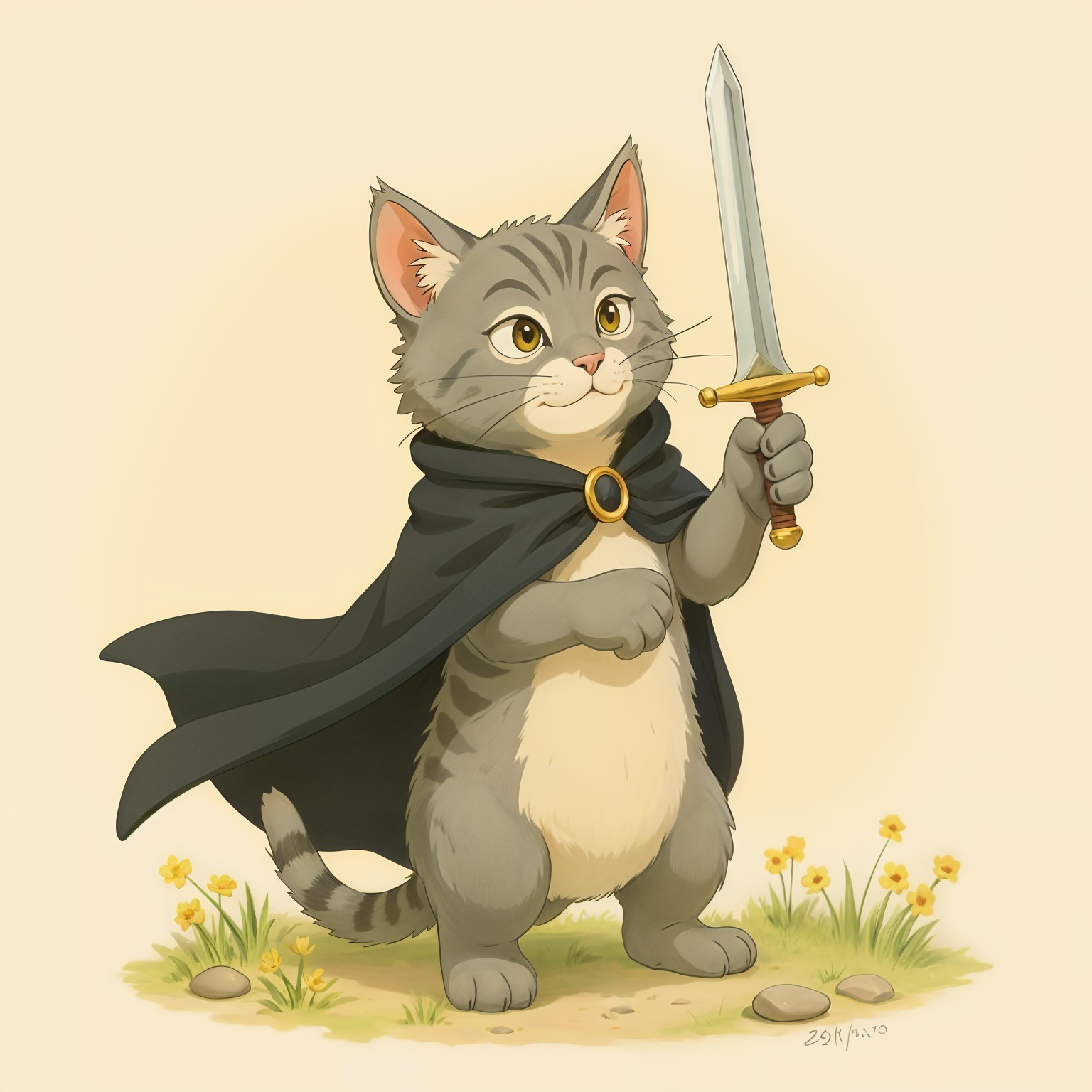 A regal kitten with striking gray fur dons a black cape, standing proudly before a glowing moon. It wields a small sword, surrounded by flowers, exuding an aura of bravery and charm.