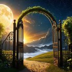 Ornate Gate Opens to Moonlit Landscape and Flowers
