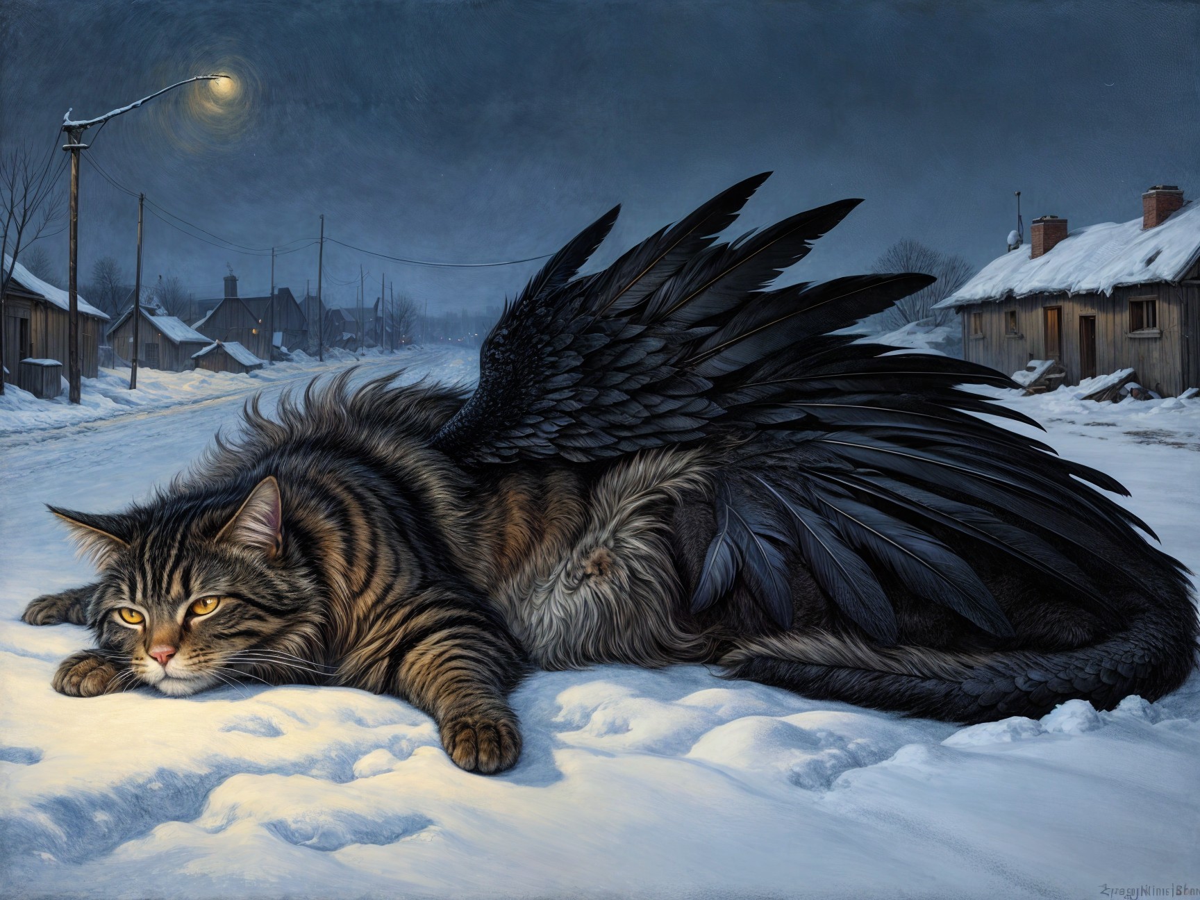 A majestic cat with large, feathered wings rests on a snowy street at night. Surrounding quaint houses are softly illuminated, creating a serene and fantastical winter scene.
