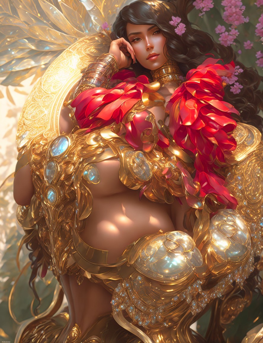 Ornate golden armor with red petal-like adornments