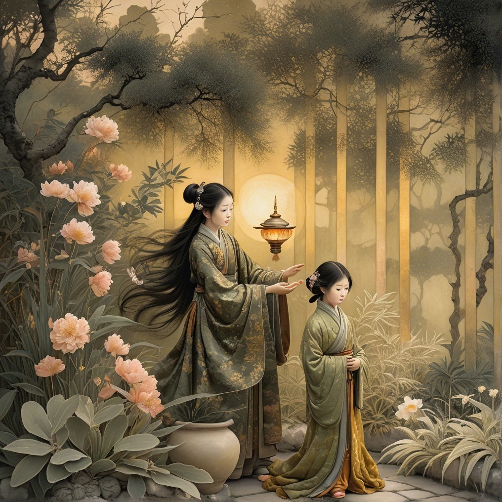 + Prompt:Girl in a beautiful garden at sunset, 3rd century Chinese miniature art, Velvet blush olive green, sage, Shabby, Dull Gold, Amber Gray, marbled. dramatic
